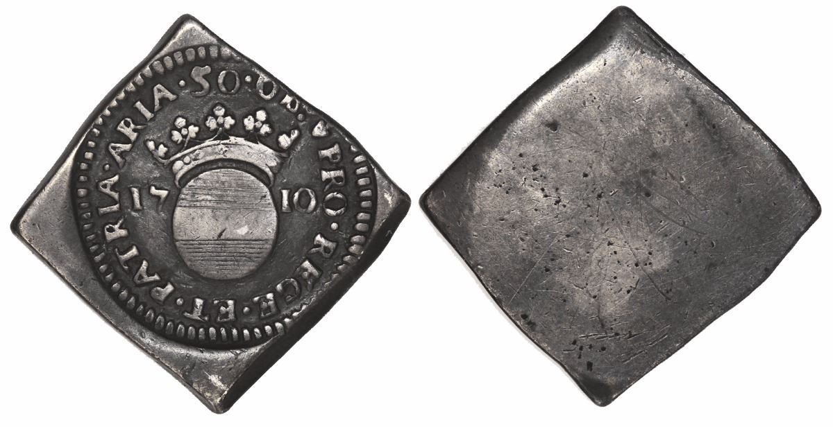 France, siege of Aire sur la Lys, uniface 50 sols, Louis XIV, 1710, rare. 14.95 grams. Deeply toned XF, boldly struck (slightly off-center) diagonally on a square flan, rather nice for this siege issue during the War of Spanish Succession, this particular area frequently fought over by the Burgundians, French and Spanish. Pedigreed to the Teitgen (France) auction of October 2015, with original lot-tag #616.