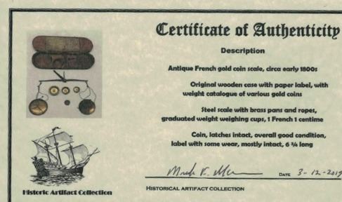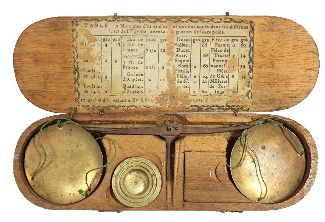 French balance scale for gold coins, early 1800s. 109 grams, 6-3/4" x 2 "x 3/4". Little gold scale with cut steel beam, original brass pans and cording, three graduated brass weights, and one French 1 centime coin, all housed in a custom wooden box with original paper trade label (mostly intact) and latches. Overall good condition and apparently operational. With photo-certificate.