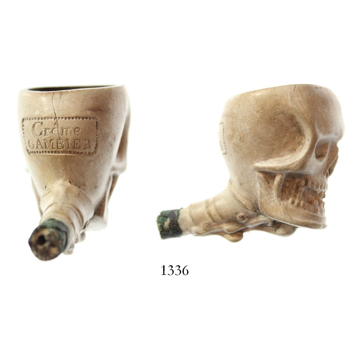 French clay pipe with skull motif, marked "Crème GRAMBIER," intact. 24 grams, roughly 2" x 1-1/2" x 1". Like lot #1972 in our 9th auction (which fetched over $900), this ornate and gruesome pipe is in the form of a complete skull, with tiny brass ring (corroded and patinated) to connect it to the (missing) stem, intact and especially desirable as showing the maker's name in beaded rectangle in the back, with hairline crack only, black inside so evidently used. With printed description tag from the salvager. Recovered from:Unidentified 1700s or early 1800s wreck in a river on the east coast of the US