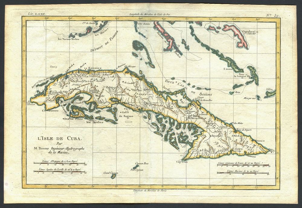 French copperplate-engraved map of Cuba and the Bahamas by Rigobert Bonne, 1780 (Paris), hand-colored. 12-1/2" x 8-1/2" Fairly accurate map of Cuba and the Bahamas (along with some of the Florida Keys and the Cayman Islands) reproduced in Bonne's "Atlas de Toutes les Parties Connues du Globe Terrestre" (Bonne served as the Royal Cartographer to France during this time) with a blank reverse including a dealer's pencil annotations in the bottom left corner. Strongly embossed map with a single vertical fold and light abrasion at the center on the word "Bahama."