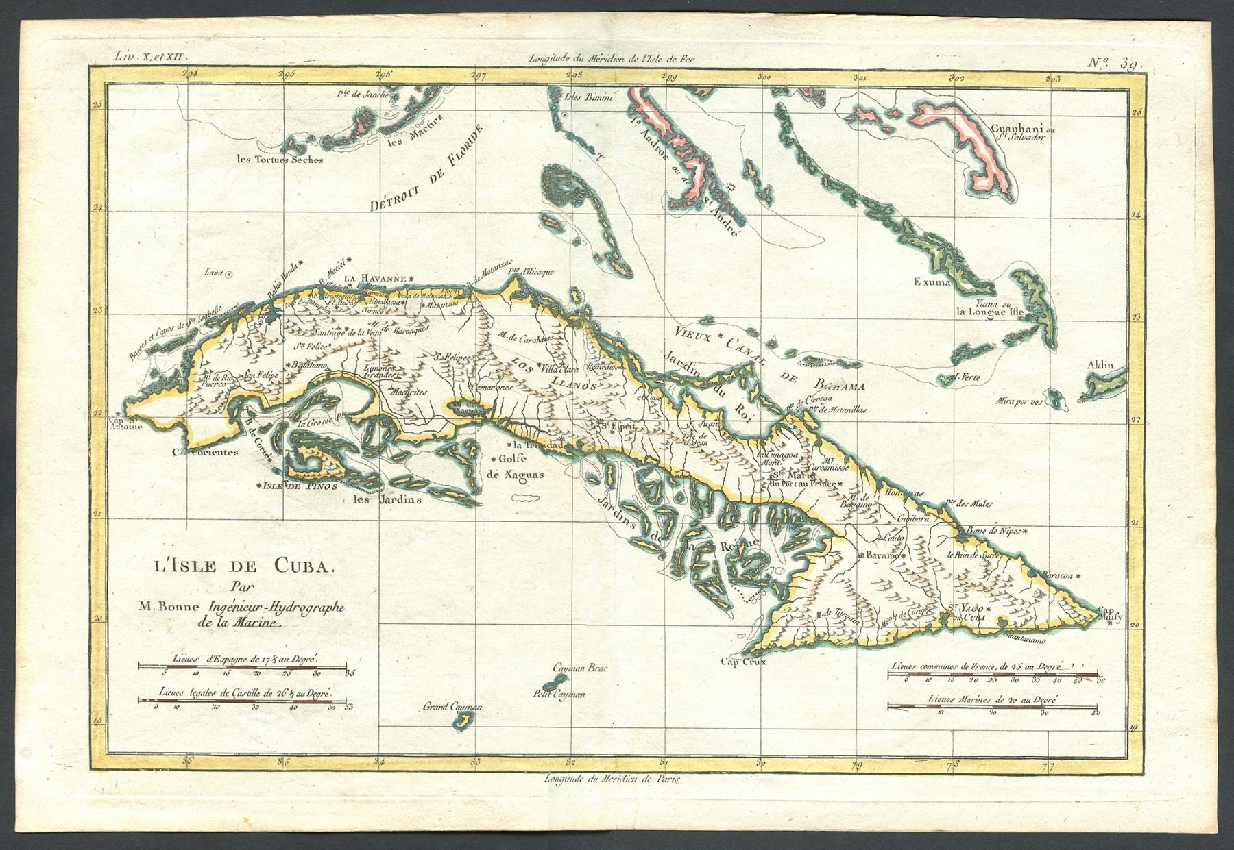 French copperplate-engraved map of Cuba and the Bahamas by Rigobert Bonne, 1780 (Paris), hand-colored. 12-1/2" x 8-1/2". Fairly accurate map of Cuba and the Bahamas (along with some of the Florida Keys and the Cayman Islands) reproduced in Bonne's "Atlas de Toutes les Parties Connues du Globe Terrestre" (Bonne served as the Royal Cartographer to France during this time) with a blank reverse including a dealer's pencil annotations in the bottom left corner. Strongly embossed map with a single vertical fold and light abrasion at the center on the word "Bahama."