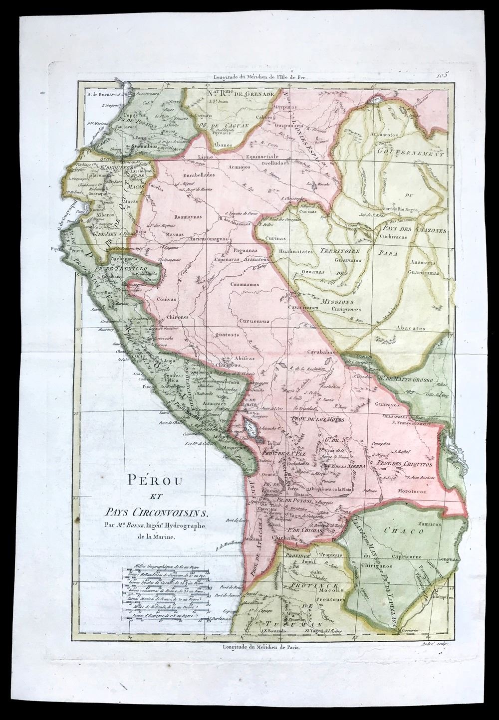 French copperplate-engraved map of Peru (with parts of Brazil, Colombia, Ecuador, Chile and Bolivia) by Rigobert Bonne titled "Perou et Pays Circonvoisins," 1787 (Paris), hand colored. 16-1/2" x 11-1/2" (image size 13-1/2" x 10"). Highly detailed map, and some of Rigobert Bonne's best work, from his famous Atlas Encyclopedique Contenant La Geographie Ancienne, et Quelques Cartes... (1787), Paris. Rigobert Bonne (1727-1795) was one of the most important cartographers of the late 18th century and succeeded Jacques Nicolas Bellin as Royal Cartographer to France in 1773. Very clean, high quality hand-colored print on fine period handmade laid paper containing a French watermark and centerfold as issued.