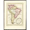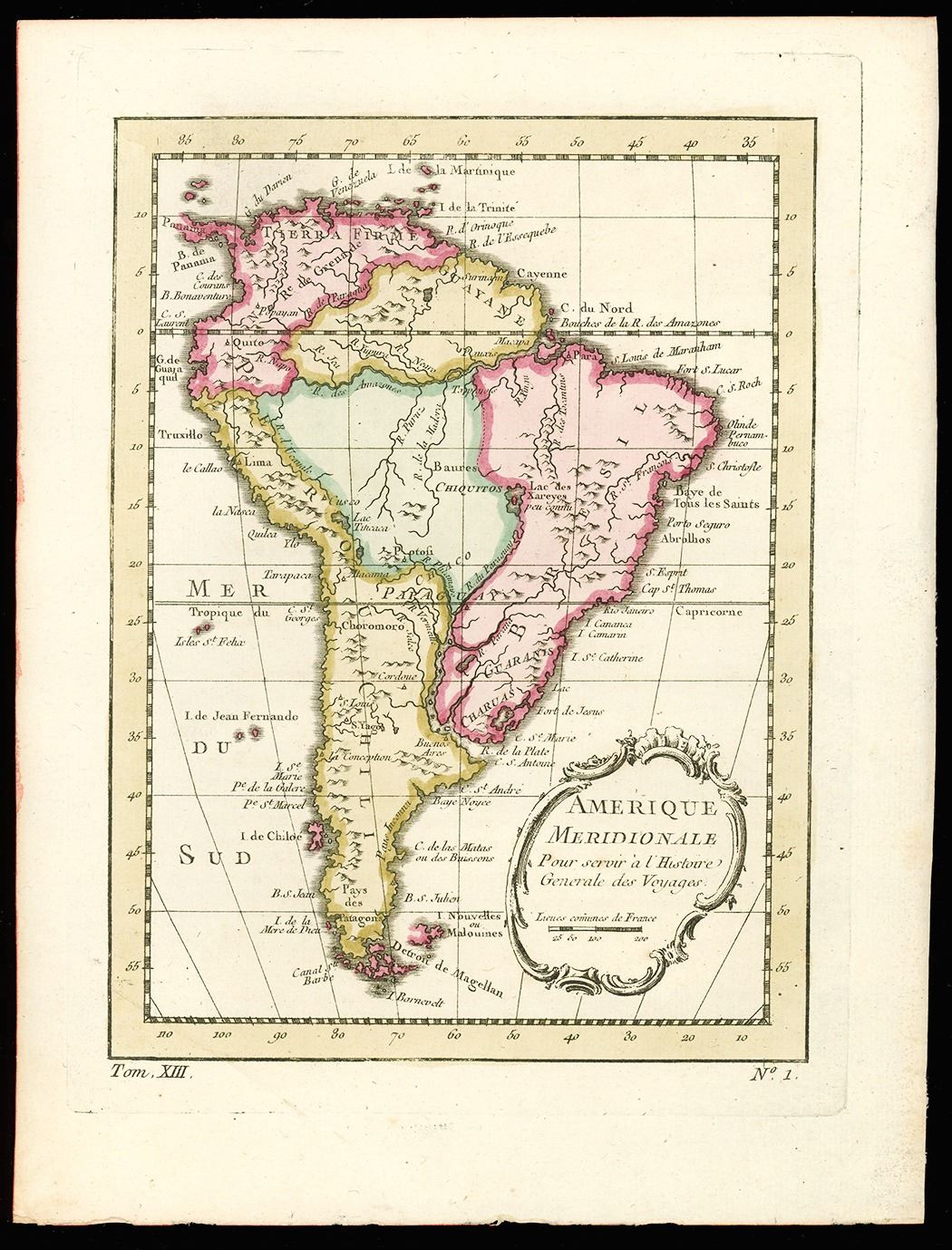 French copperplate-engraved map of entire South American continent by Jacques Nicolas Bellin titled "Amerique Meridionale. Pour servir a l' Histoire Generale des Voyages," 1754 (Paris), hand colored. 10" x 7-1/2" (image size 7-3/4" x 5-3/4"). From Jacques Nicolas Bellin's 1764 Le Petit Atlas Maritime Recueil De Cartes Et Plans Des Quatre Parties Du Monde. In 1721 at age 18, Jacques Nicolas Bellin (1703-1772), was appointed chief cartographer to the French Navy and in 1741, he was named official hydrographer to the French king. Nicely hand colored petite map on fine period handmade laid paper.