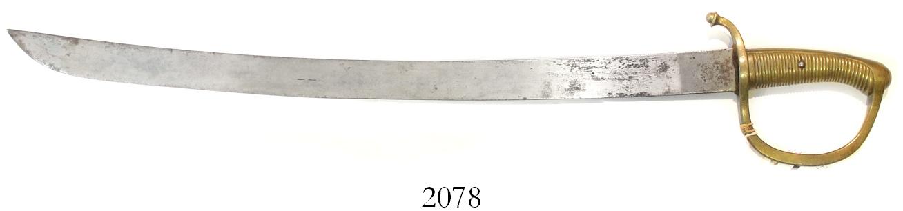 French infantry saber, 1800s. 826 grams; 28" long. Decent but simple piece (made for using, not just ceremonial), with slightly curved 1-1/2" blade that is clean but with some minor surface rust on edge, crown touchmark above 7 near hilt, brass handle with curved point, ribbed grip. With Little John's auction tag.