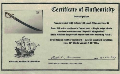 French model 1808 infantry hanger sword (briquet). 1222 grams, 30" overall length, 23" blade. Brass D-guard style hilt with ropelike turnings and touch marks and unit marking "PDL" attached to a single-bladed sword marked "Royal D Klinginthal" and dated “Aout [August] 1827”, complete with brass-tipped leather scabbard, all in excellent condition. With photo-certificate.