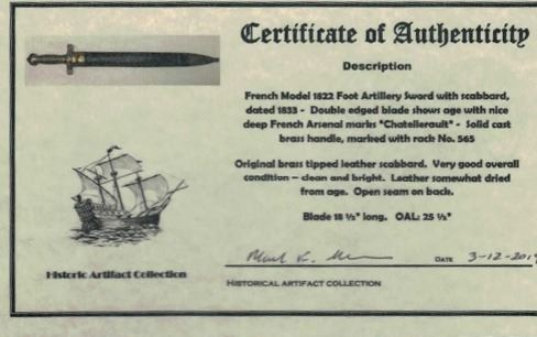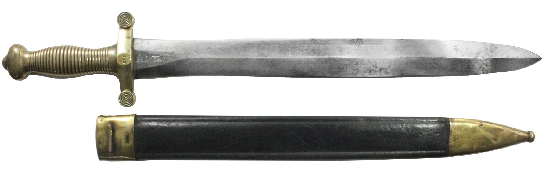 French model 1822 foot artillery sword. 1399 grams, 25-1/2" overall length, 18-1/2" blade. Heavy and impressive double-edge sword with solid cast brass handle marked with rack No. 565 and original brass-tipped scabbard. Blade marked "Chatellerault 1833," handle bright and clean, ropelike turning and simple, elegant scrolls on sides, scabbard leather somewhat dry from age with open seam on back. With photo-certificate.