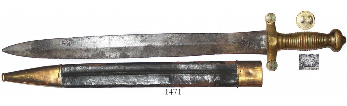 French short artillery sword in scabbard, ca. 1820-1840, possibly used in the Mexican War of Independence. 1339 grams, 27-1/2" long. Double-edged blade with signs of heavy use, plain brass hilt with arsenal marks on crossbar, original black-leather scabbard that has lost its rigidity but is essentially intact, with bright brass receptacle and tip. With photo-certificate.