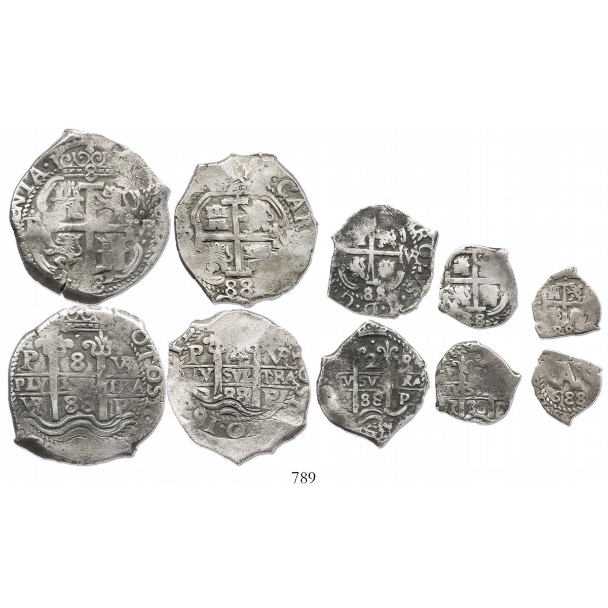 Full set of 8-4-2-1-1/2 reales 1688VR, ex-Sellschopp collection. S-P39. 52.2 grams total. Cobs date-sets are very hard to assemble these days, and many of the Sellschopp sets like this one have been long since broken up. What stands out most in this set is the 4R, with 3 dates and choice full cross, but all the other denominations have multiple dates (yes, even the 1/2R) and nice details, the average grade being VF, with generally attractive toning, hence a premium set even without the famous pedigree. Pedigreed to the Sellschopp collection, sold by Swiss Bank Corp. (Zurich) in 1988 (Auction #20).