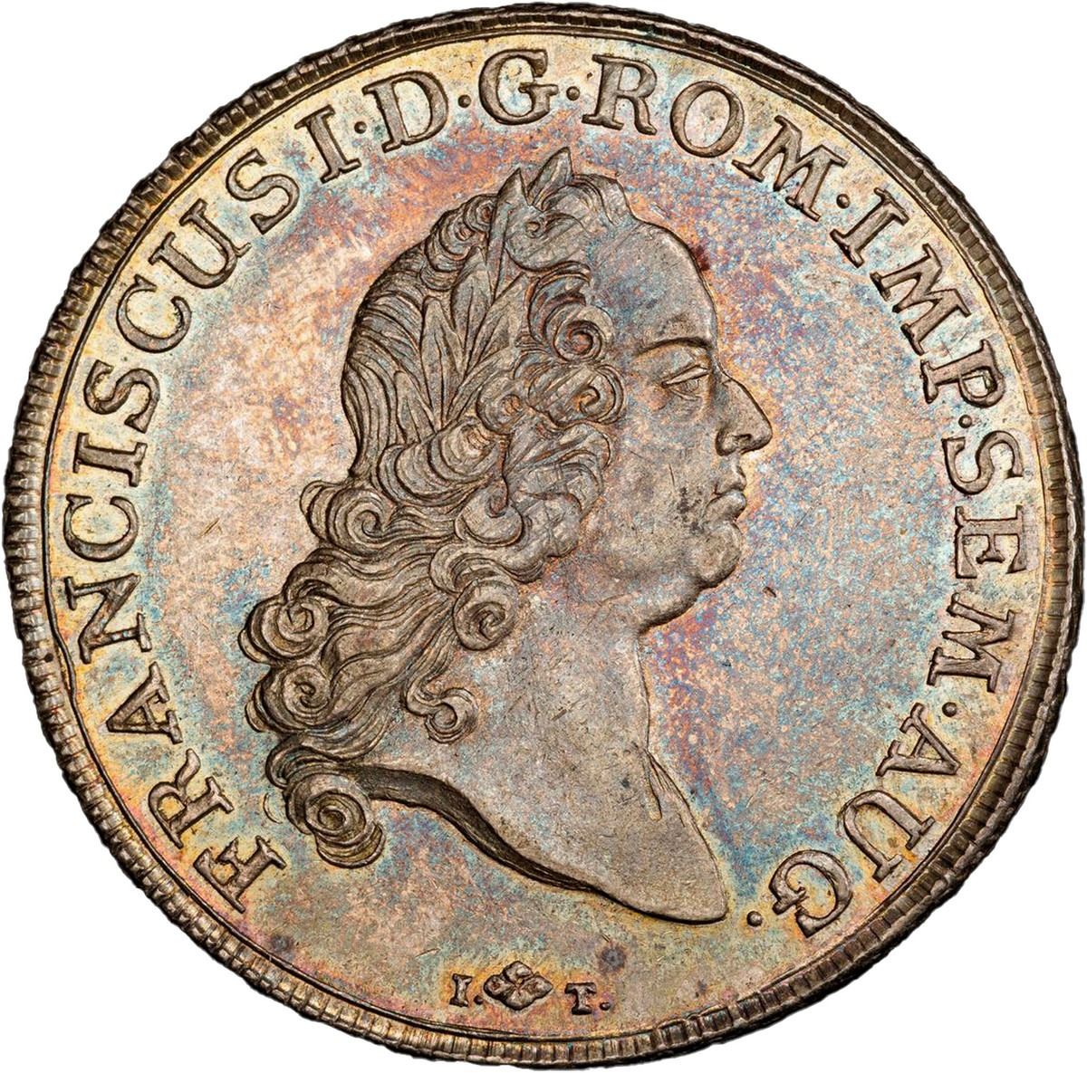 GERMAN STATES, Augsburg, taler, Franz I, 1765 IT-F(A)H, PCGS MS63, finest known in PCGS census. Forster-655; Dav-1930; KM-184. Immensely appealing with colorful rainbow toning over bright luster (the obverse with intense magenta to blue morphing to yellow in legend, the reverse with orange transitional to indigo at rim), practically no marks, a phenomenal coin for the period that stands alone atop a current census of fifteen coins at PCGS.
