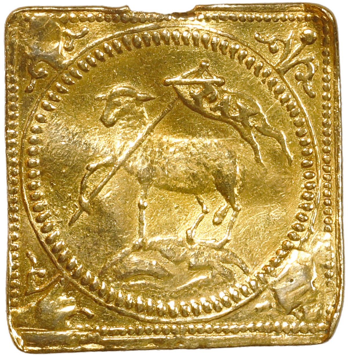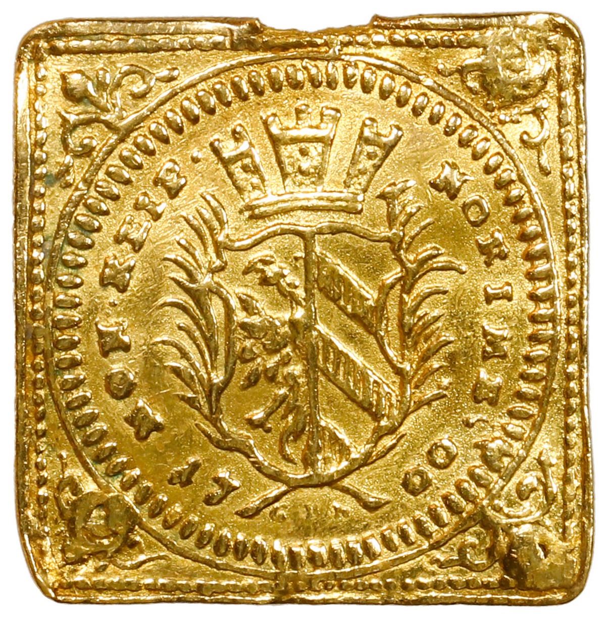 GERMAN STATES, Nürnberg (free city), gold ½ ducat klippe, 1700 GFN. Fr-1890A; KM-256. 1.69 grams. Mintmaster Georg Friedrich Nürnberger. AU with plugged holes in three corners, spot of damage on edge, design details still quite sharp.