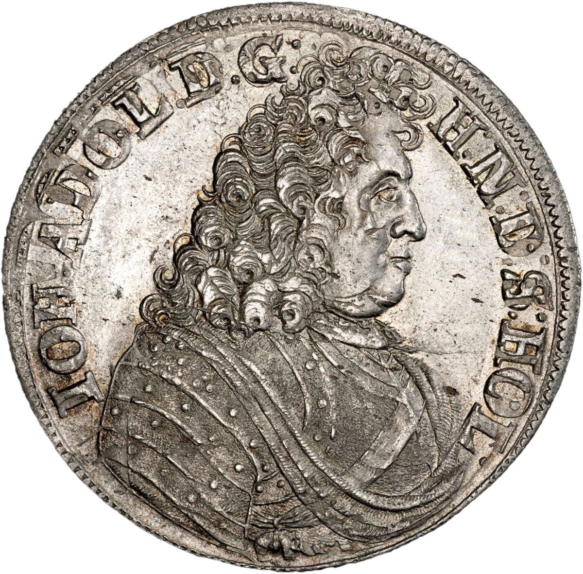 GERMAN STATES, Schleswig-Holstein-Ploen, Glückstadt mint, 2/3 taler, Johann Adolph, 1690, double-struck, PCGS MS63, finest and only example in PCGS census. Sieg-6; Dav-571; KM-16. 16.08 grams. Frosty luster tinged with faint yellow color, very bold and sharp details in a curiously rotated double-strike but exceptional in grade and visibly much nicer than the Bruun specimen in same grade sold last year.
