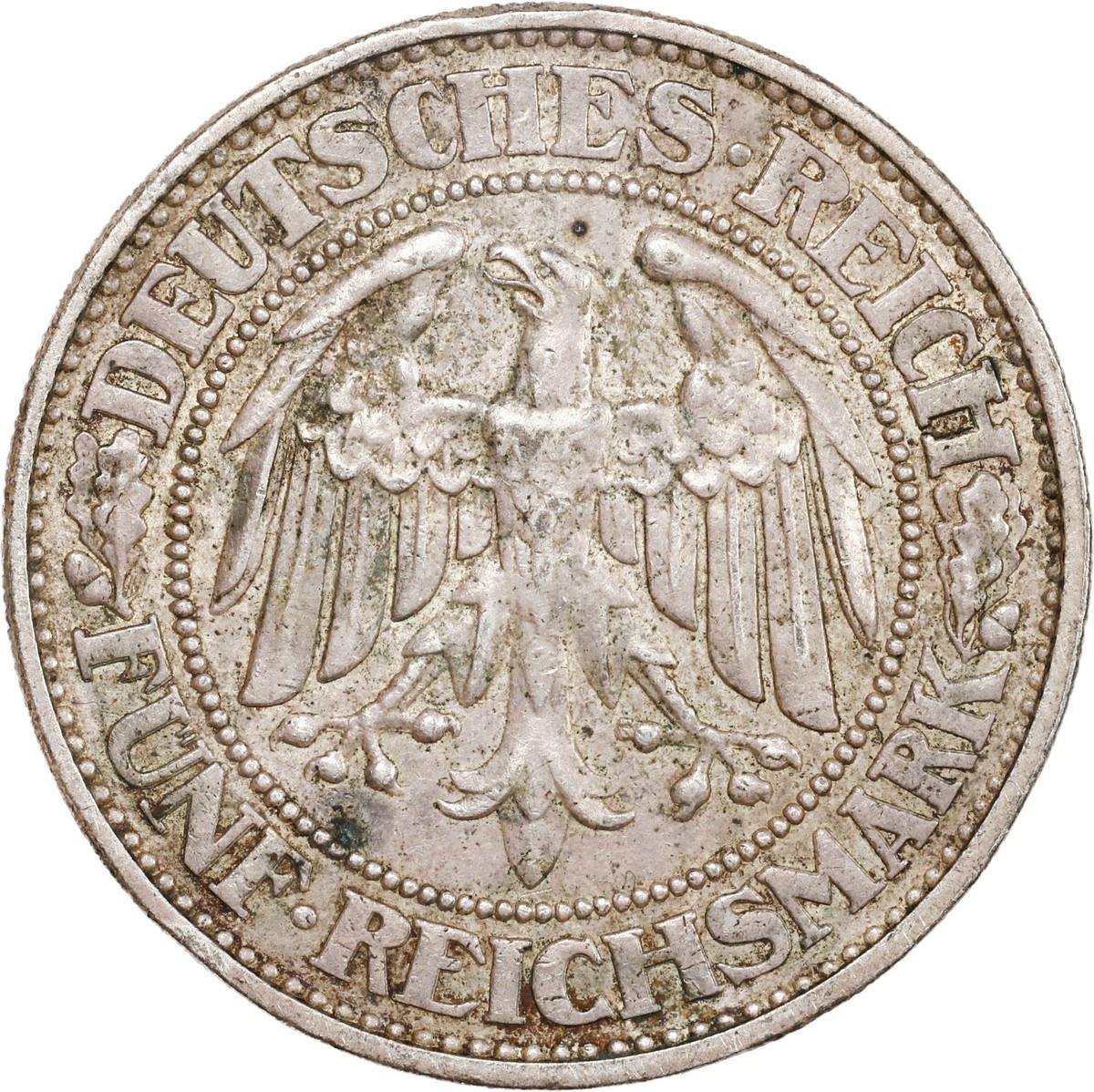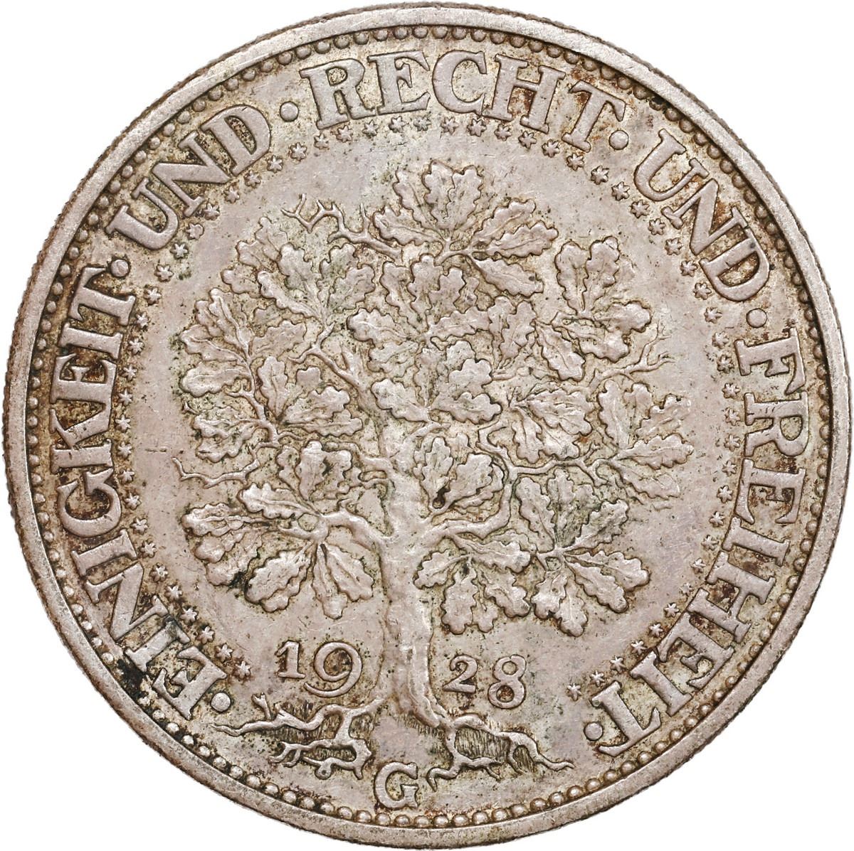 GERMANY, Weimar Republic, Karlsruhe mint, "oak tree" 5 mark, 1928-G.