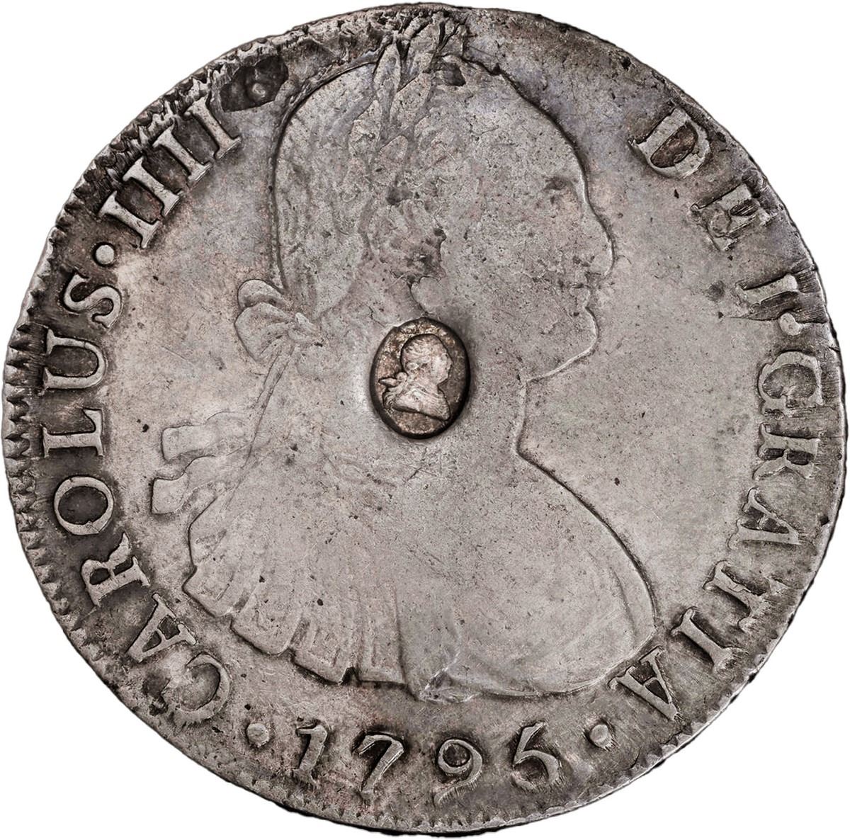 GREAT BRITAIN, Bank of England, dollar (4 shillings 9 pence), George III, bust in oval indent countermark (1797) on a Lima, Peru, bust 8 reales, Charles IV, 1795 IJ, PCGS VF35. Sp-3765A; ESC-133; KM-638. Bold AU countermark in the epicenter of a well-toned host with muted luster, an appealing example of this popular type.