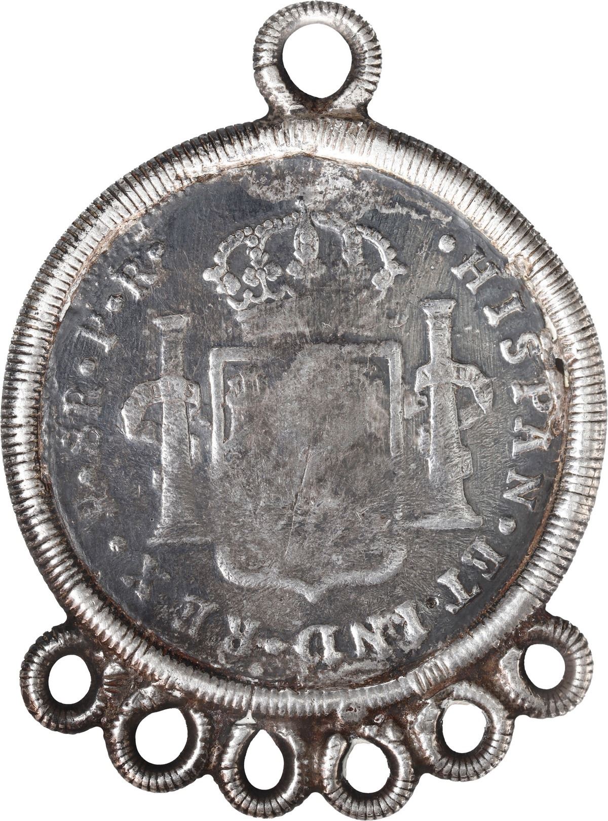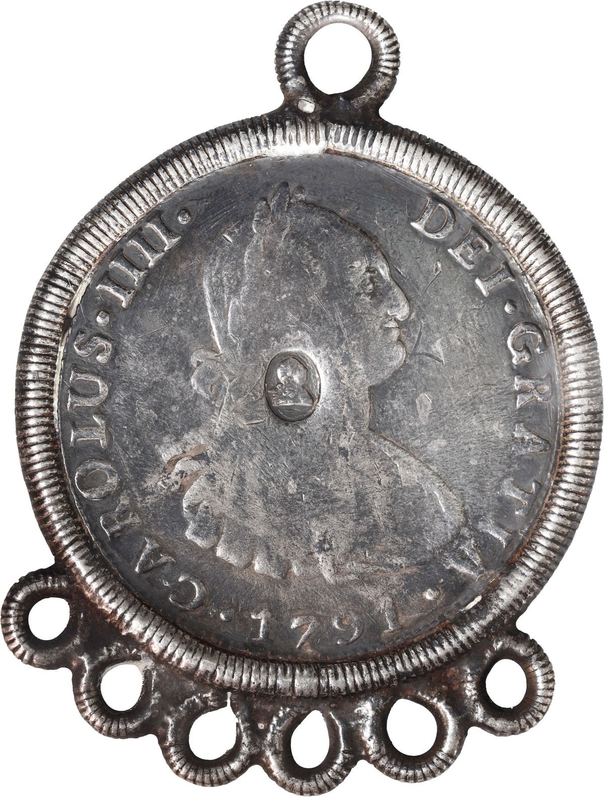 GREAT BRITAIN, Bank of England, dollar (4 shillings 9 pence), George III, bust in oval indent countermark (1797) on a Potosí, Bolivia, bust 8 reales, Charles IV, 1791 PR, mounted in silver old bezel with loop. KM-634; S-3765A. 45.47 grams total. Bold George III oval countermark on Charles IV's neck, the host coin about Fine with heavy surface polishing, now toned over with dark blue hues, set into an unusual yet sturdy pendant setting with six loops along the bottom.