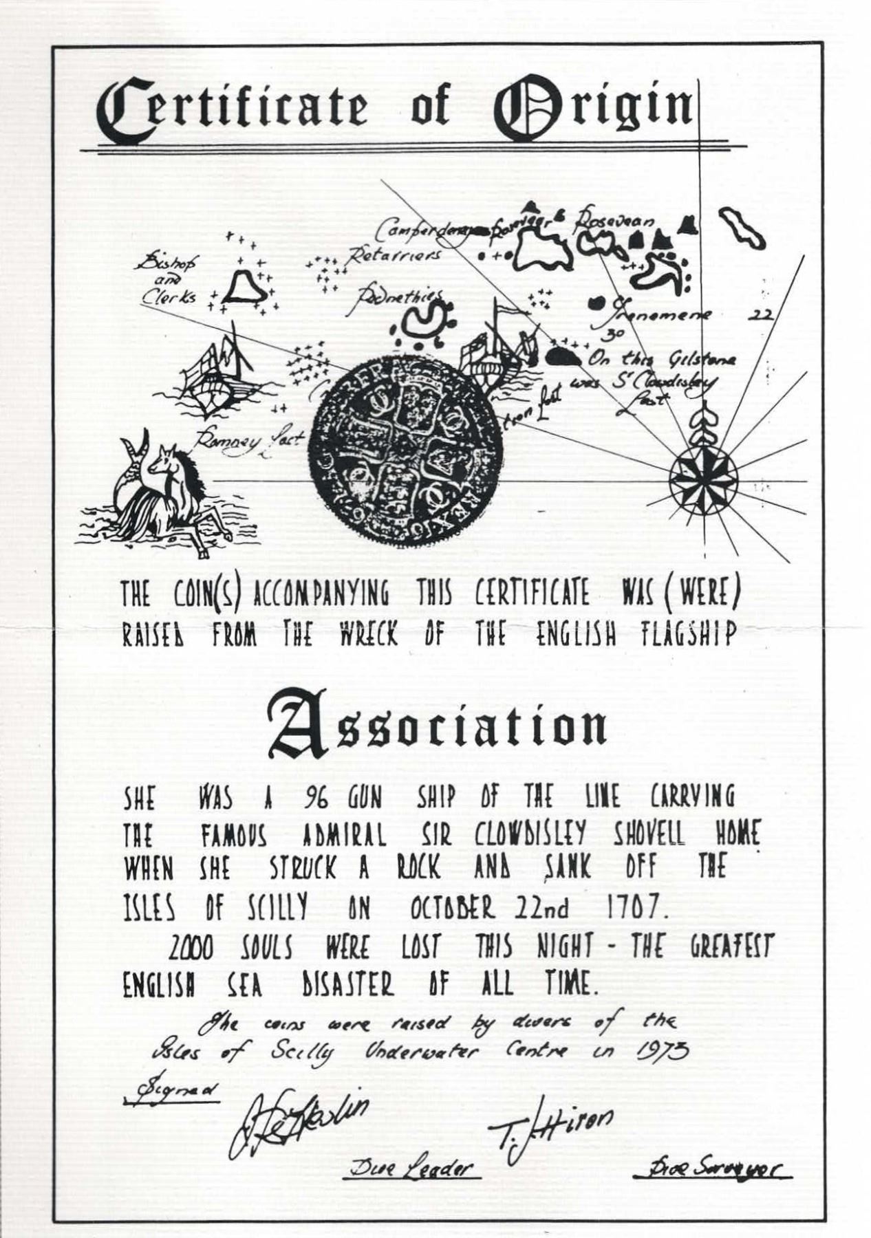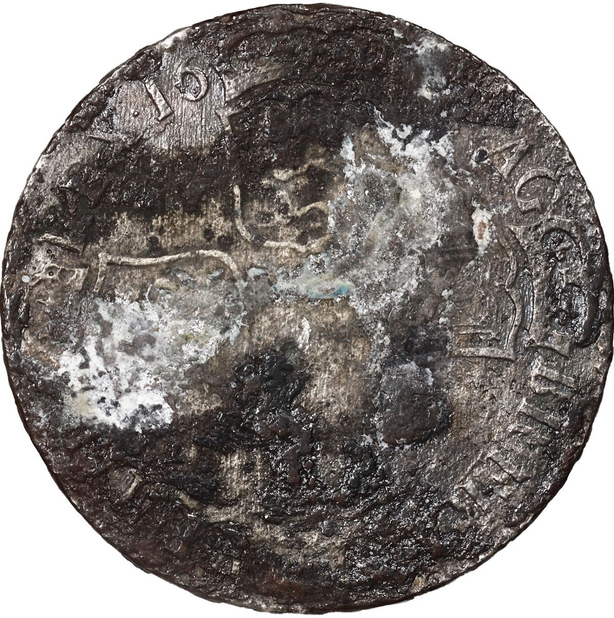 GREAT BRITAIN, Exeter mint, half crown, William III, 1696-E, first bust, small shields, early harp. KM-491.10; Bull 1069 (R4); ESC 537; Sp-3478. 12.96 grams. Solid piece with patchy encrustation as originally found though just enough detail showing through to identify the date and mintmark, first example of this date and mint from this wreck that we have offered. With generic certificate from the salvors. Recovered from: Association, sunk in 1707 off the Isles of Scilly, south west of England