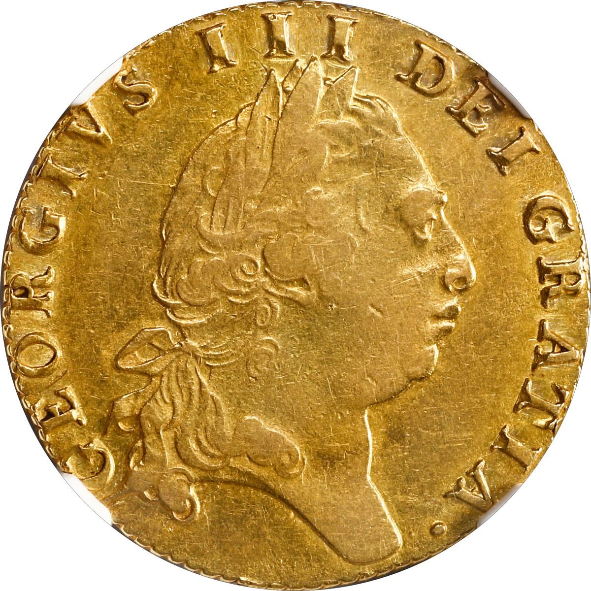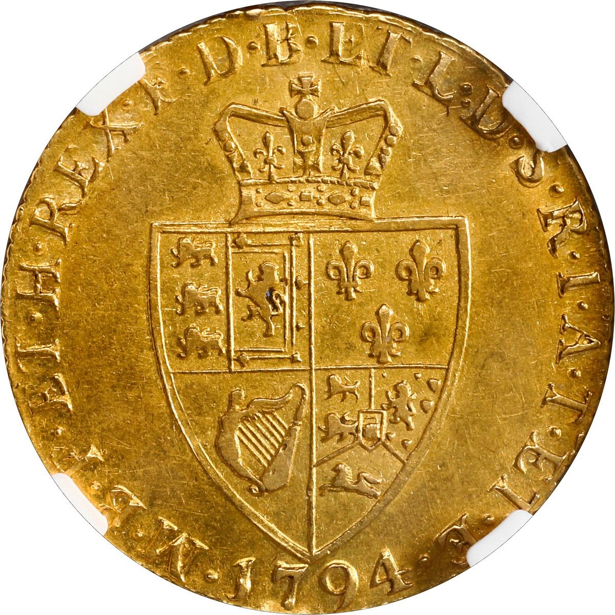 GREAT BRITAIN, London, England, gold guinea, George III, 1794, NGC AU 50. Sp-3729; KM-609; Fr-356. Rich gold color with muted luster, only light high-point wear, a nice example of the so-called "spade guinea" in reference to the shape of the arms on reverse.