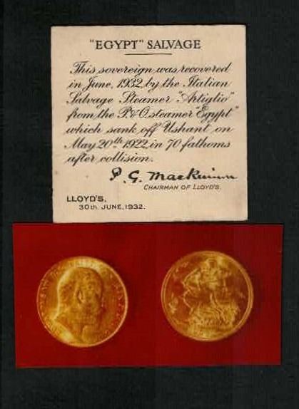 GREAT BRITAIN, London, England, gold sovereign, Edward VII, 1906, ex-Lloyd's. Sp-3969; KM-805; Fr-400. 7.99 grams. Lustrous UNC with minor bagmarks only. With original small certificate signed by the Chairman of Lloyd's of London in 1932 (P.G. MacKinnon). Recovered from: S.S. Egypt, sunk in 1922 off Ushant, France