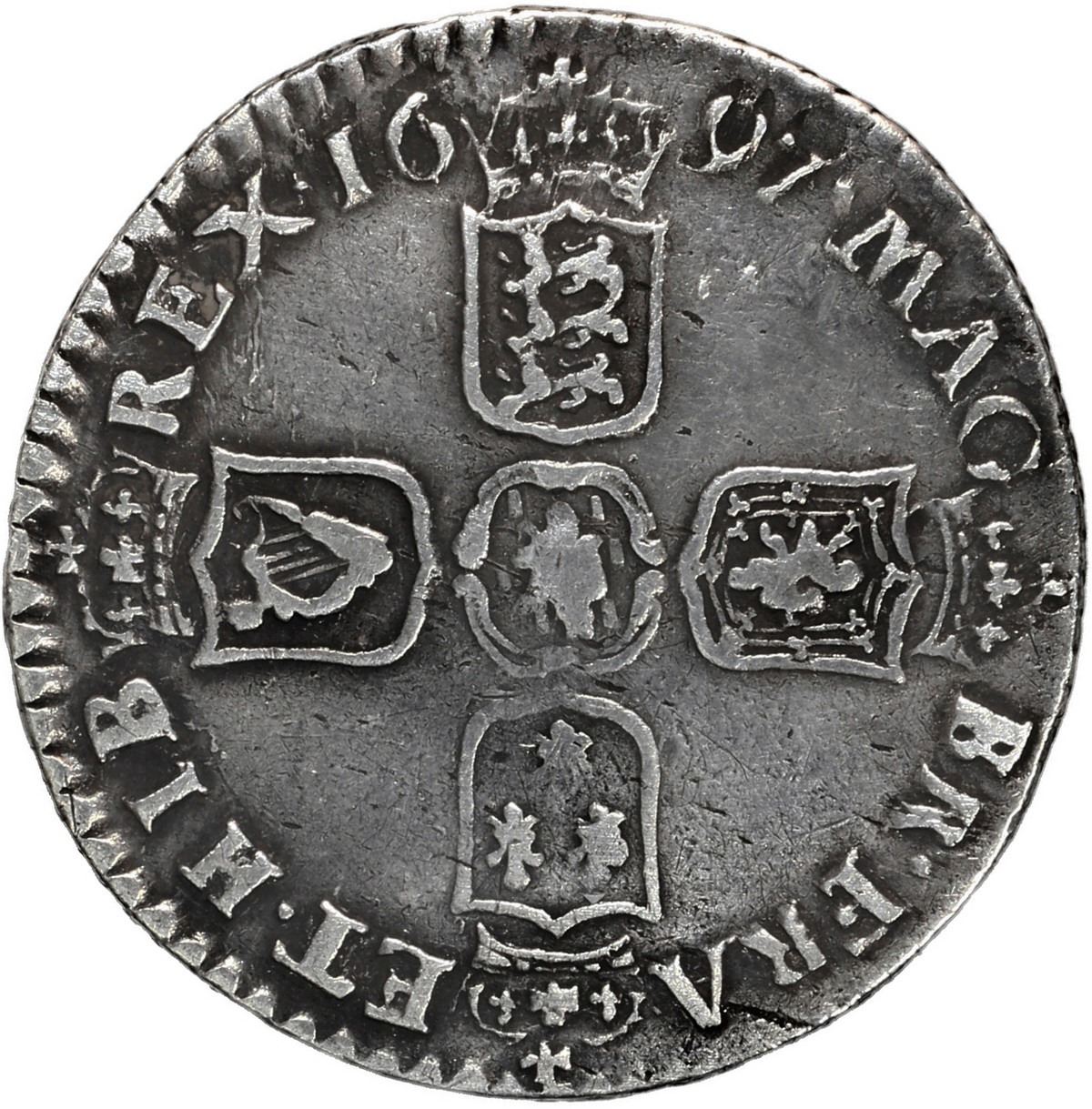 GREAT BRITAIN, London, England, sixpence, William III, 1697, second bust. Sp-3537; KM-489. 2.83 grams. Uncorroded VF with bold full details enhanced by contrasting toning, very cute and choice. Recovered from: Association, sunk in 1707 off the Isles of Scilly, south west of England