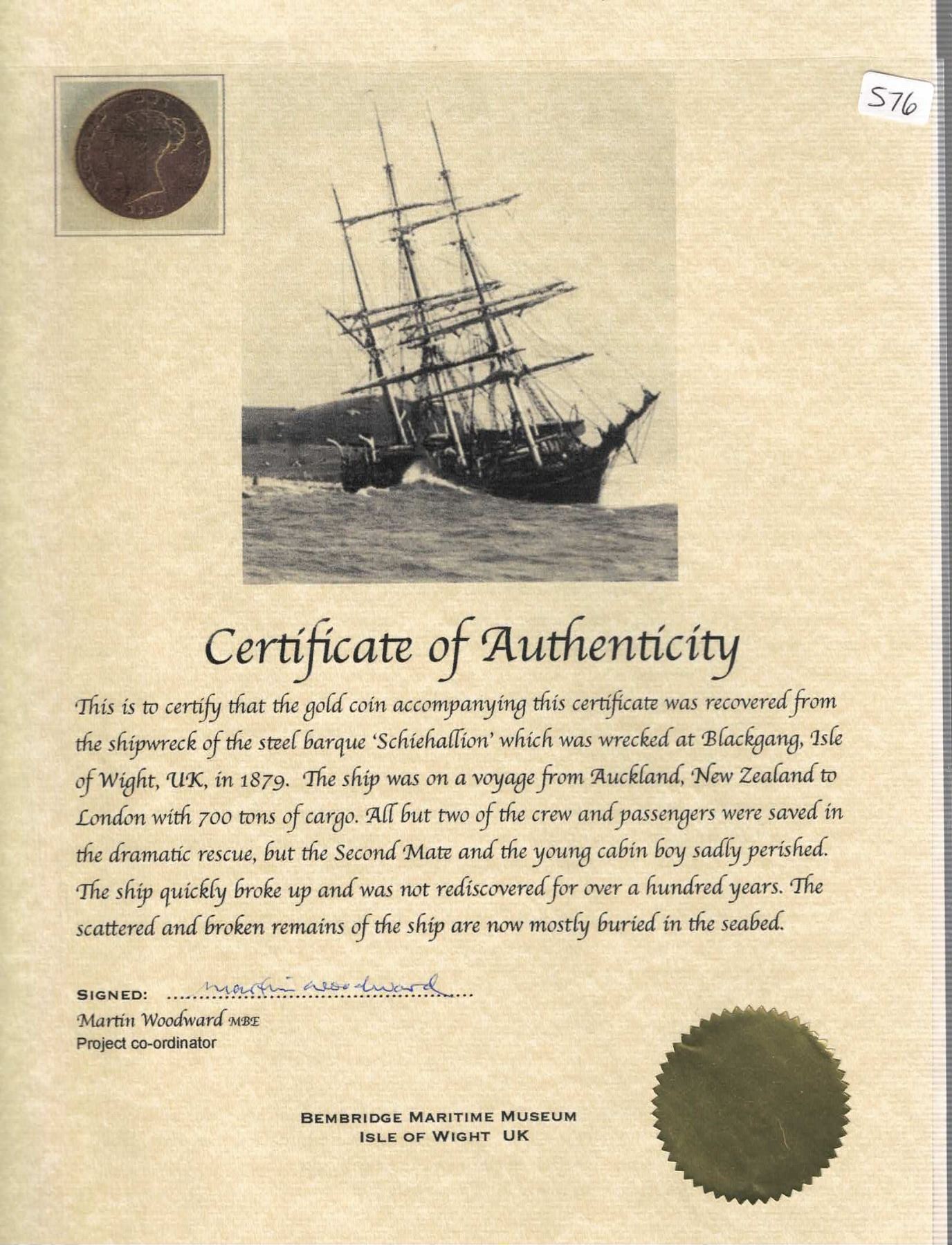 GREAT BRITAIN, London, gold ½ sovereign, Victoria (young head), 1842, NGC VG 8 (Shipwreck Blue Label). Sp-3859; KM-735,1; Fr-389b. 3.85 grams. Worn but problem-free, and of course desirable as a straight-graded coin from a shipwreck. With original photo-certificate from the salvor. Recovered from: Schiehallion, sunk in 1879 off the Isle of Wight, England