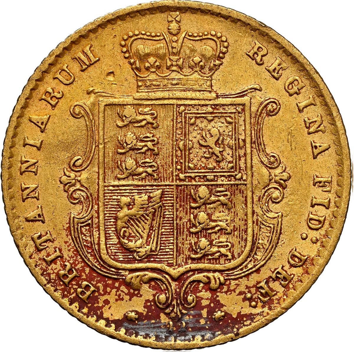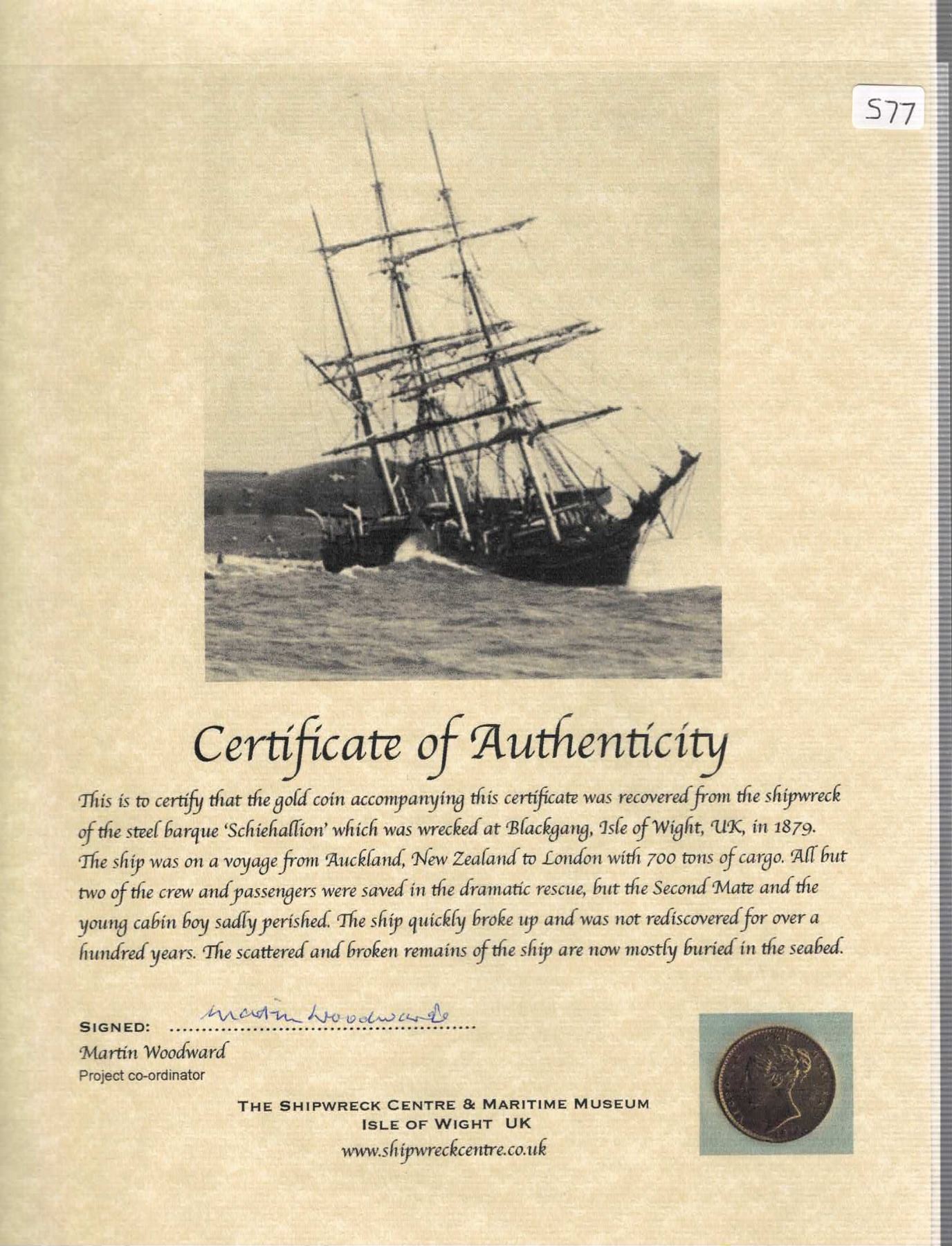 GREAT BRITAIN, London, gold ½ sovereign, Victoria (young head), 1871, die 12, NGC AU details / saltwater damage, obv scratch (Shipwreck Blue Label). Sp-3860; KM-735.2; Fr-389f. 3.94 grams. Matte obverse with muted luster, light scratch on bust, the reverse with deep purple staining at bottom. With original photo-certificate from the salvor. Recovered from: Schiehallion, sunk in 1879 off the Isle of Wight, England