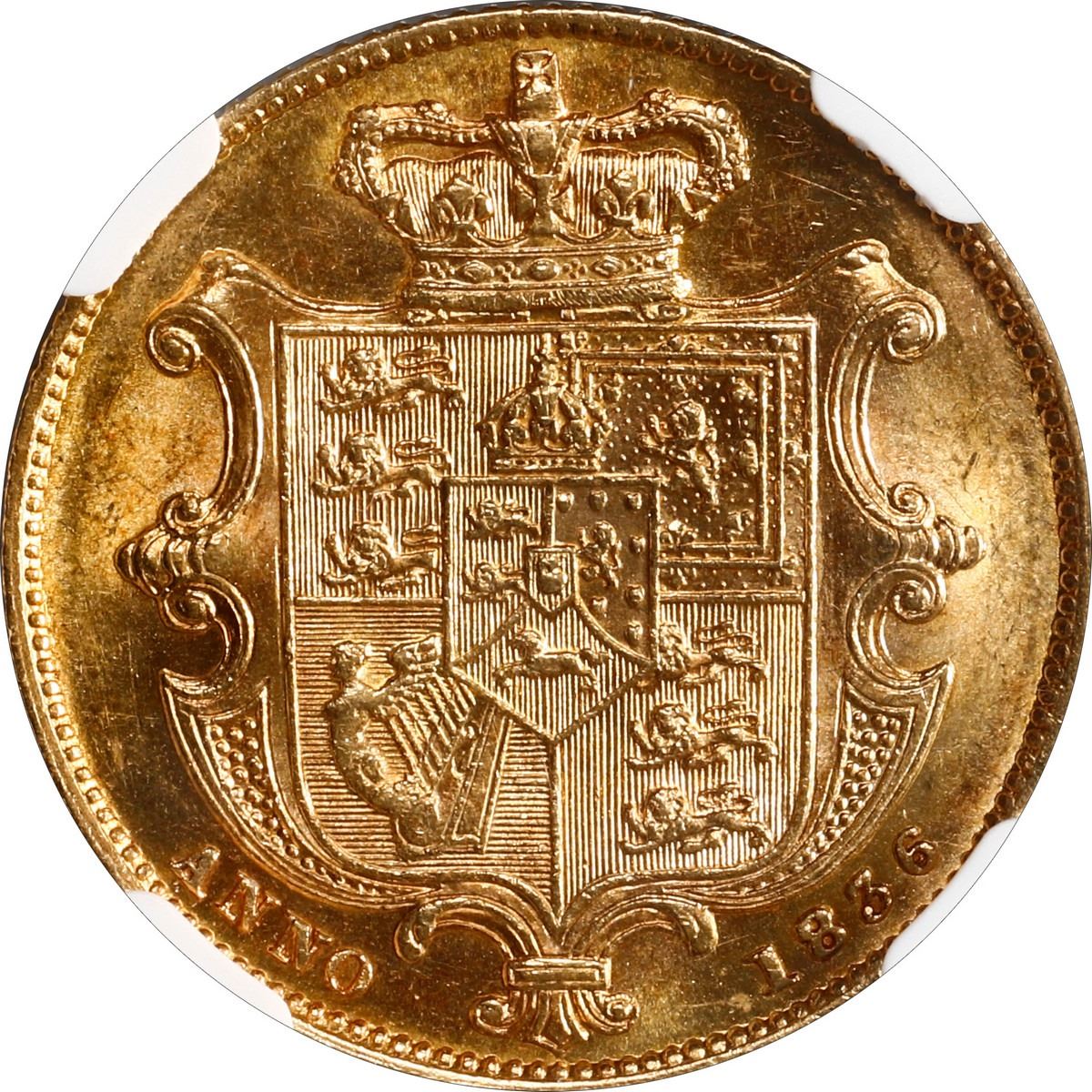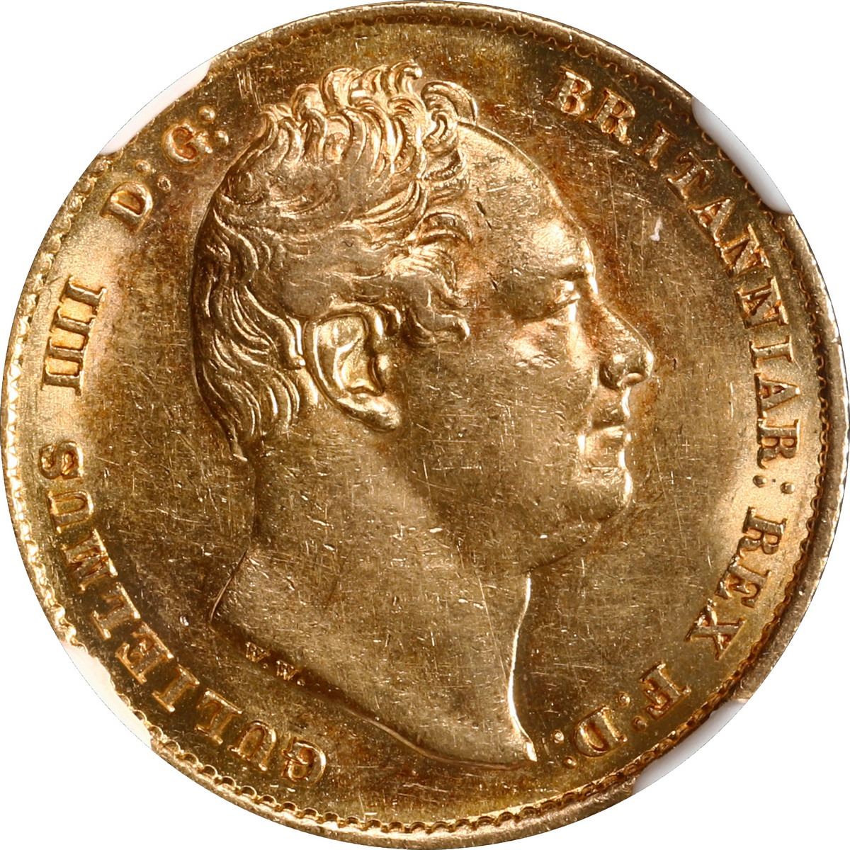 GREAT BRITAIN, London, gold sovereign, William IV, 1836, NGC AU 58. Sp-3829B; KM-717; Fr-383. Choice cartwheel luster that demands a higher grade, rich gold color with faint hints of red toning, faintly hairlined but still probably the nicest sub-MS sovereign you will ever see.