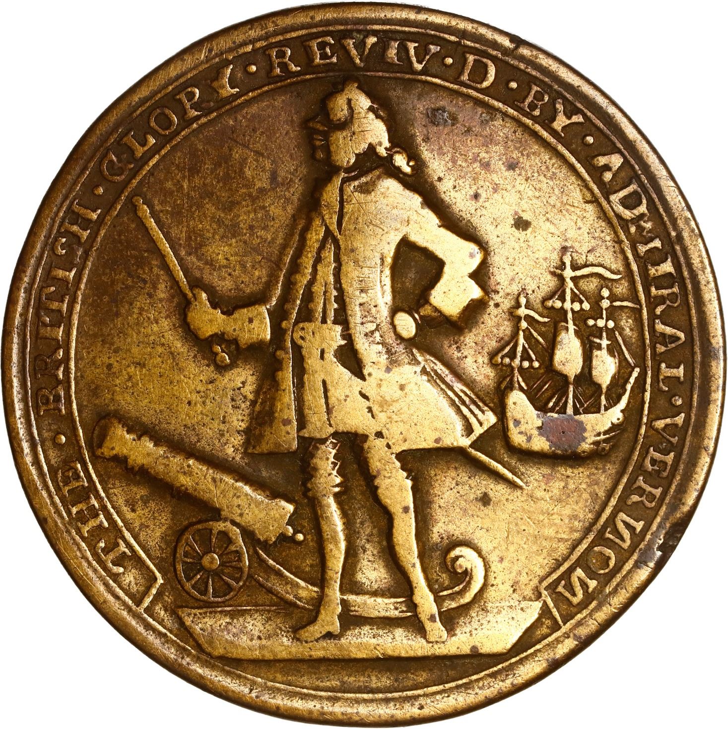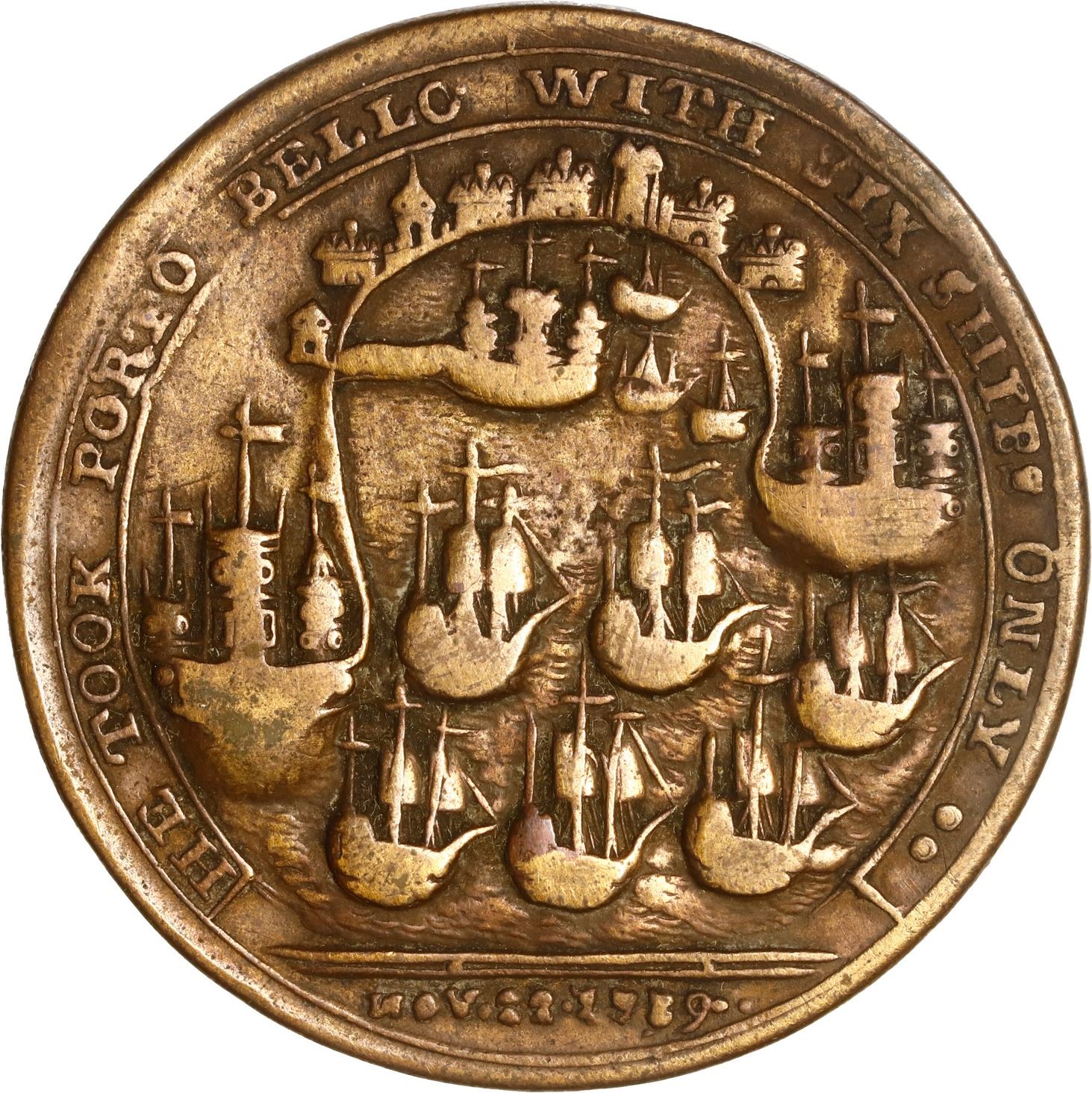 GREAT BRITAIN, copper alloy Admiral Vernon medal, 1739, Vernon with cannon and ship / Porto Bello. AC-PBvi5E. 12.87 grams. 40 mm. VF with brassy, cleaned obverse, toned reverse.