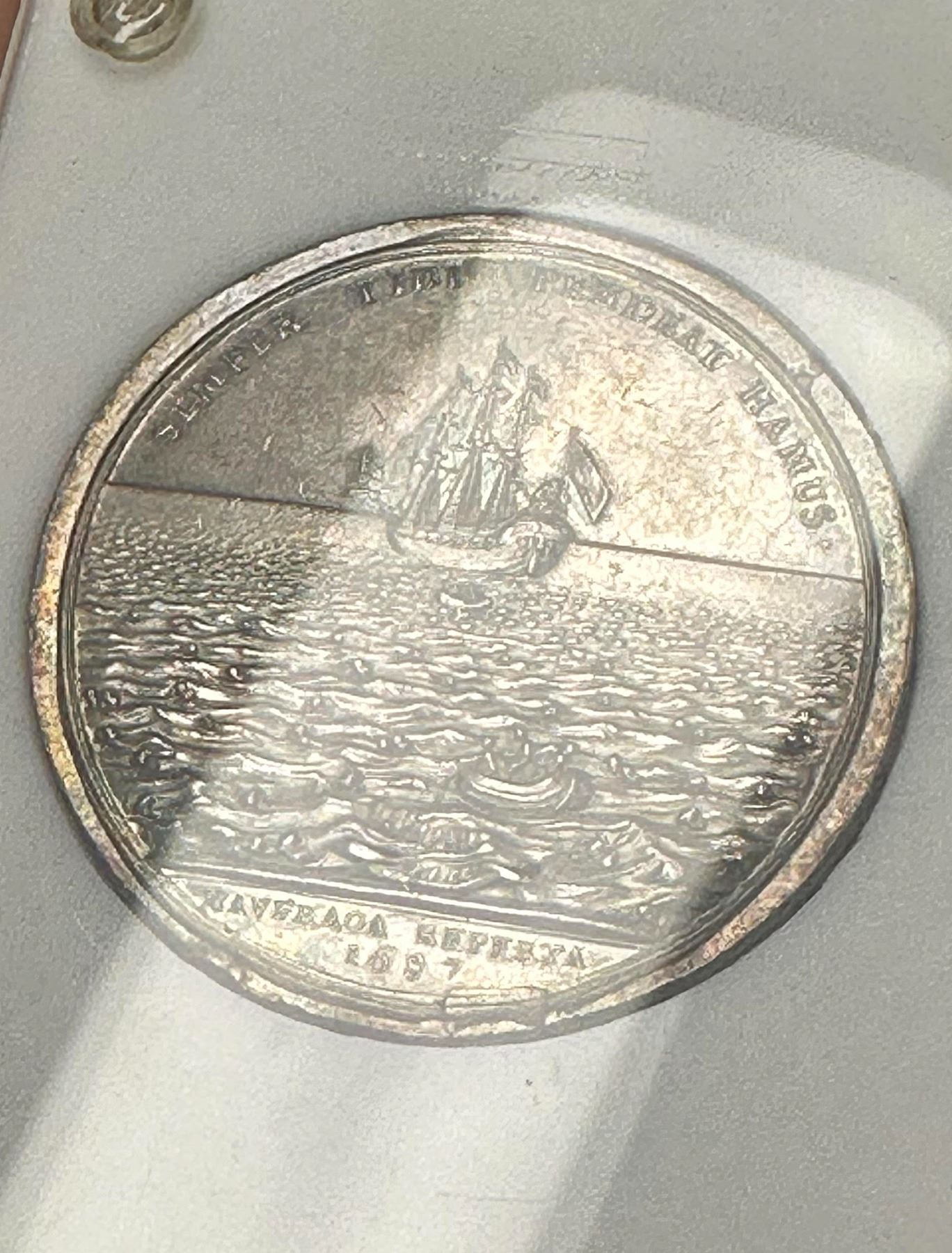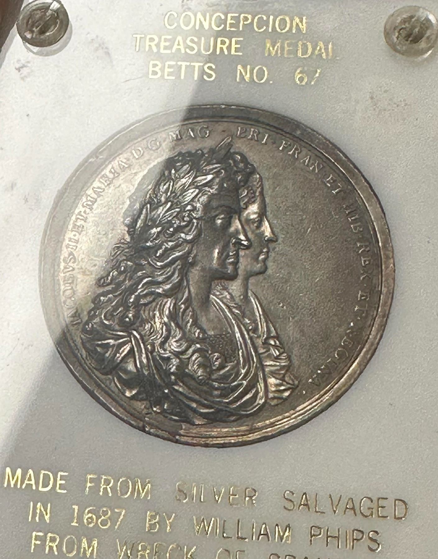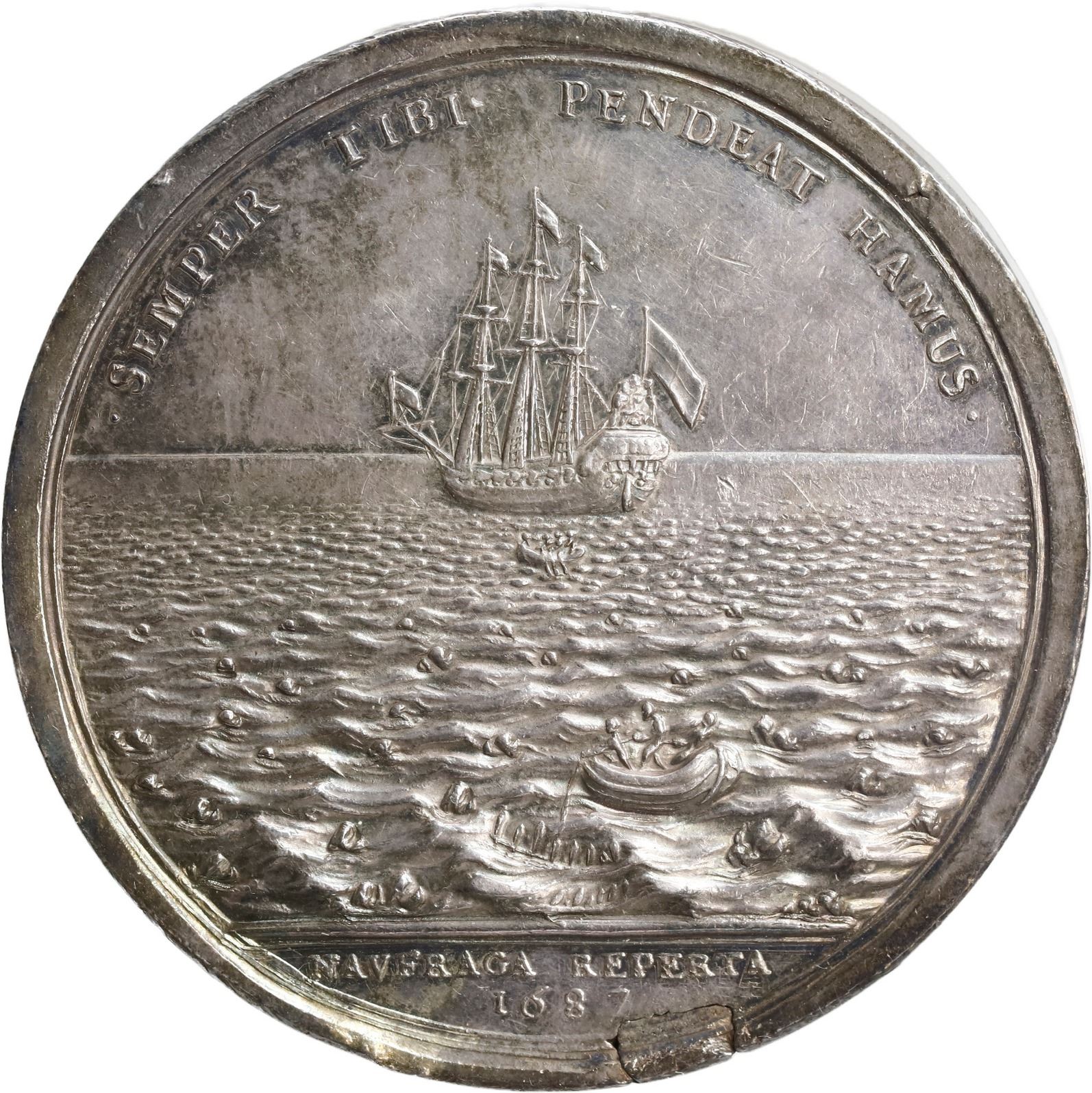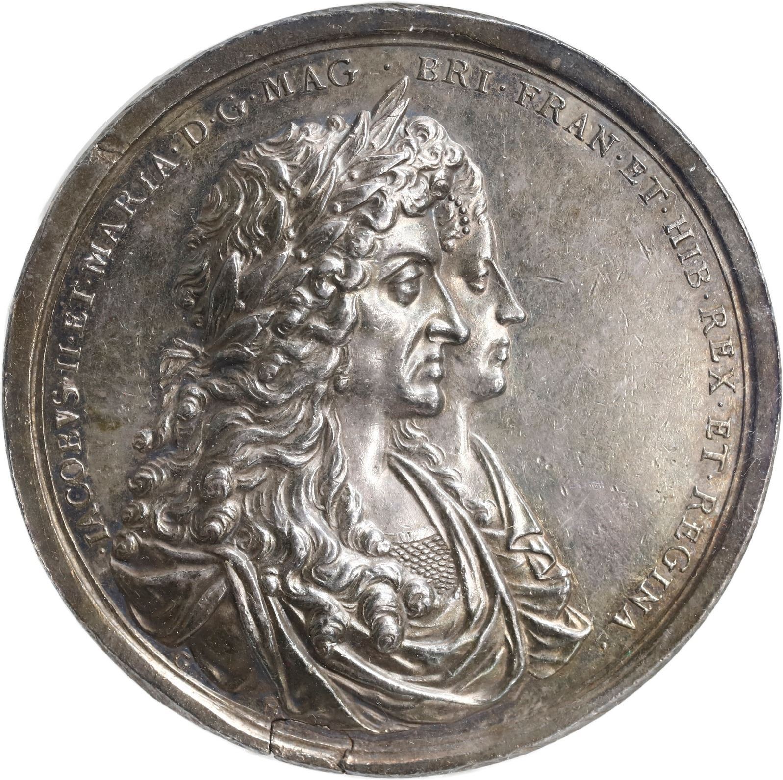 GREAT BRITAIN, large silver medal, 1687, James II / salvage of the Concepción by William Phips, by G. Bower, ex-Brand, housed in custom plastic holder printed with information. Betts-67; Eimer-285; MI-619/33. 55 mm. Obverse with conjoined busts of king and queen within legend • IACOBVS • II • ET • MARIA • D • G • MAG • BRI • FRAN • ET • HIB • REX • ET • REGINA •; reverse with • SEMPER TIBI PENDEAT HAMUS • encircling the scene of a sailing ship at sea behind rowboat with men search for treasure from the wreck, NAVFRAGA REPERTA / 1687 in exergue. A famous and important medal, both for British medal collectors (who refer to it as the "Recovery of Treasure at St. Domingo" medal) and American historians, but also for the growing legions of shipwreck enthusiasts, as this piece was commissioned in commemoration for the salvage of the Spanish ship Concepción (sunk in 1641 off Hispaniola) by New Englander Sir William Phips using silver actually recovered from the wreck. This pedigreed example is nicely rainbow toned with minor marks and only light wear (AU), minor rim-bumps but also an edge-flaw near the bottom. Pedigreed to the Brand Collection.