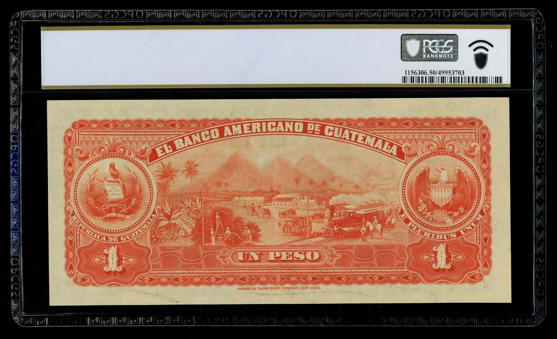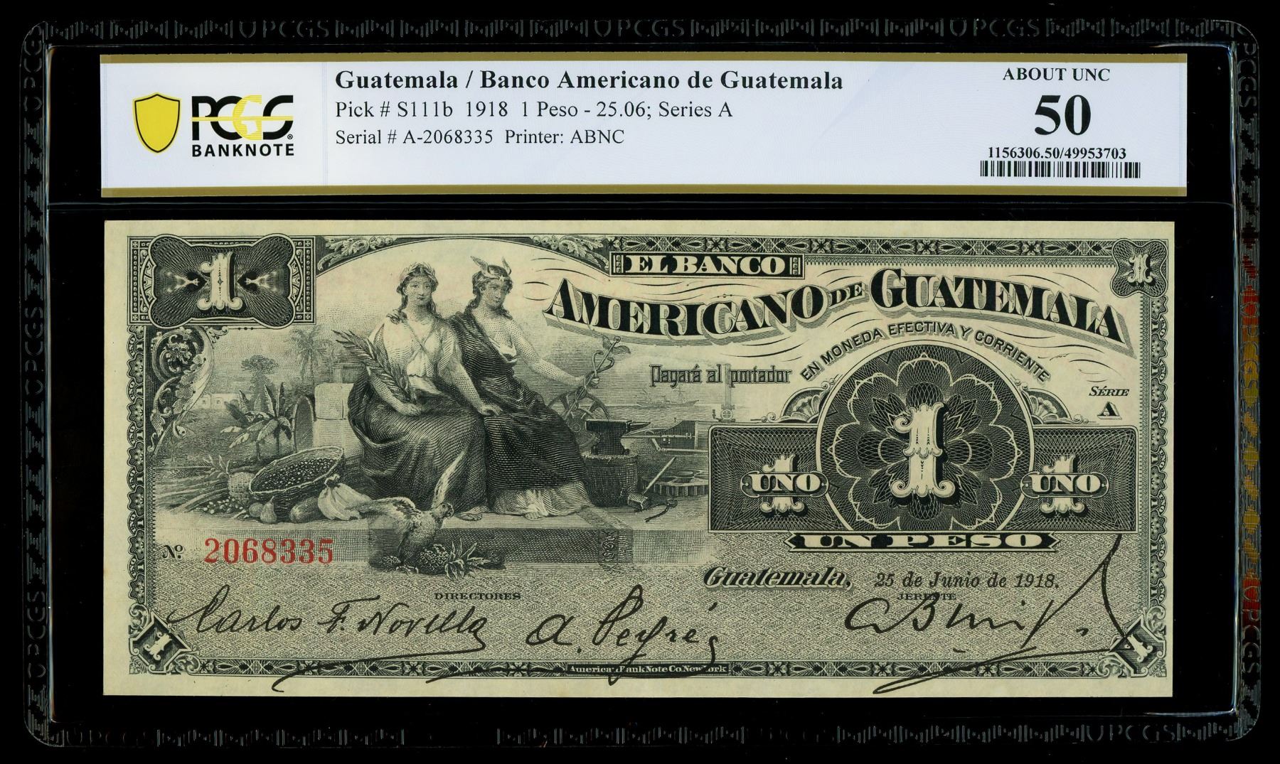 GUATEMALA, Banco Americano, 1 peso, 25-6-1918, series A, serial 2068335, PCGS Banknote About UNC 50, finest known in PCGS census. Pick-S111b. Nice, lightly handled example of this private bank note, some light paper toning around the margins, one of just two examples in the PCGS census.