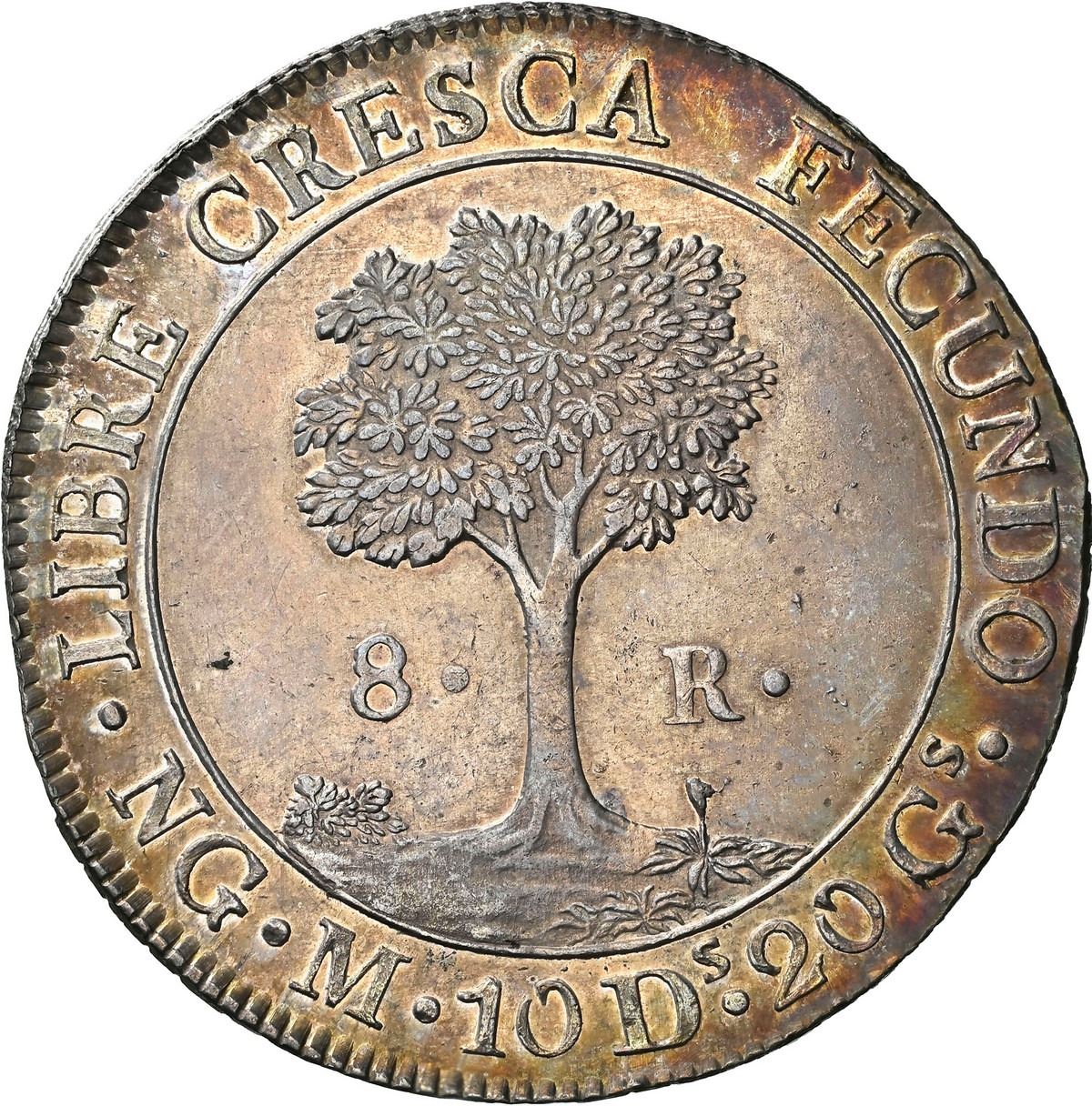 GUATEMALA (Central American Republic), Guatemala City, 8 reales, 1826 M, NGC MS 62. KM-4. Choice luster under rich golden-rainbow toning, well struck on a very slightly out-of-round flan, with extra metal at top-right and bottom-left of 6 of date that could be related to 6/5 overdate, currently tied with two others for second finest in the NGC census behind a single MS 63 among a population of 74 entries without overdate (and matching the finest certified as 1826/5).