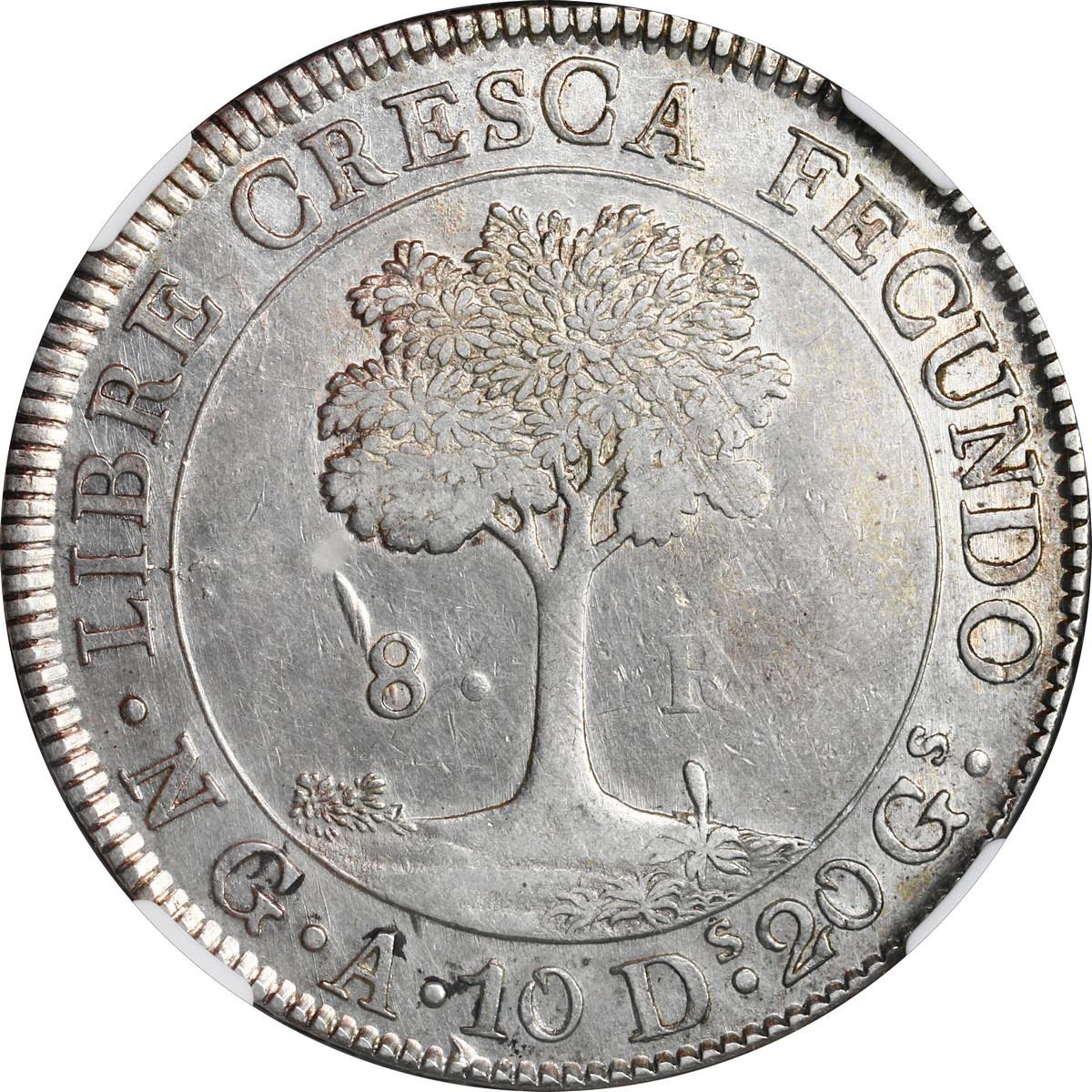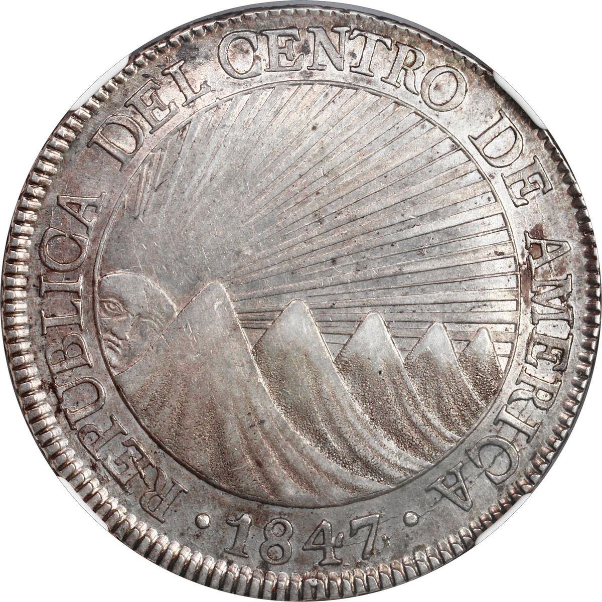 GUATEMALA (Central American Republic), Guatemala City, 8 reales, 1847/6 A, NGC AU 53, ex-Busto. KM-4. Very lightly gray-toned, with some softly struck spots (and piece of extra metal) on tree side but also with full rims and decent luster throughout. Pedigreed to the José Busto Collection.