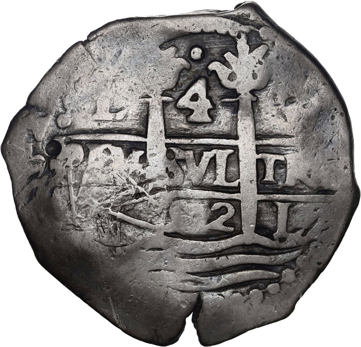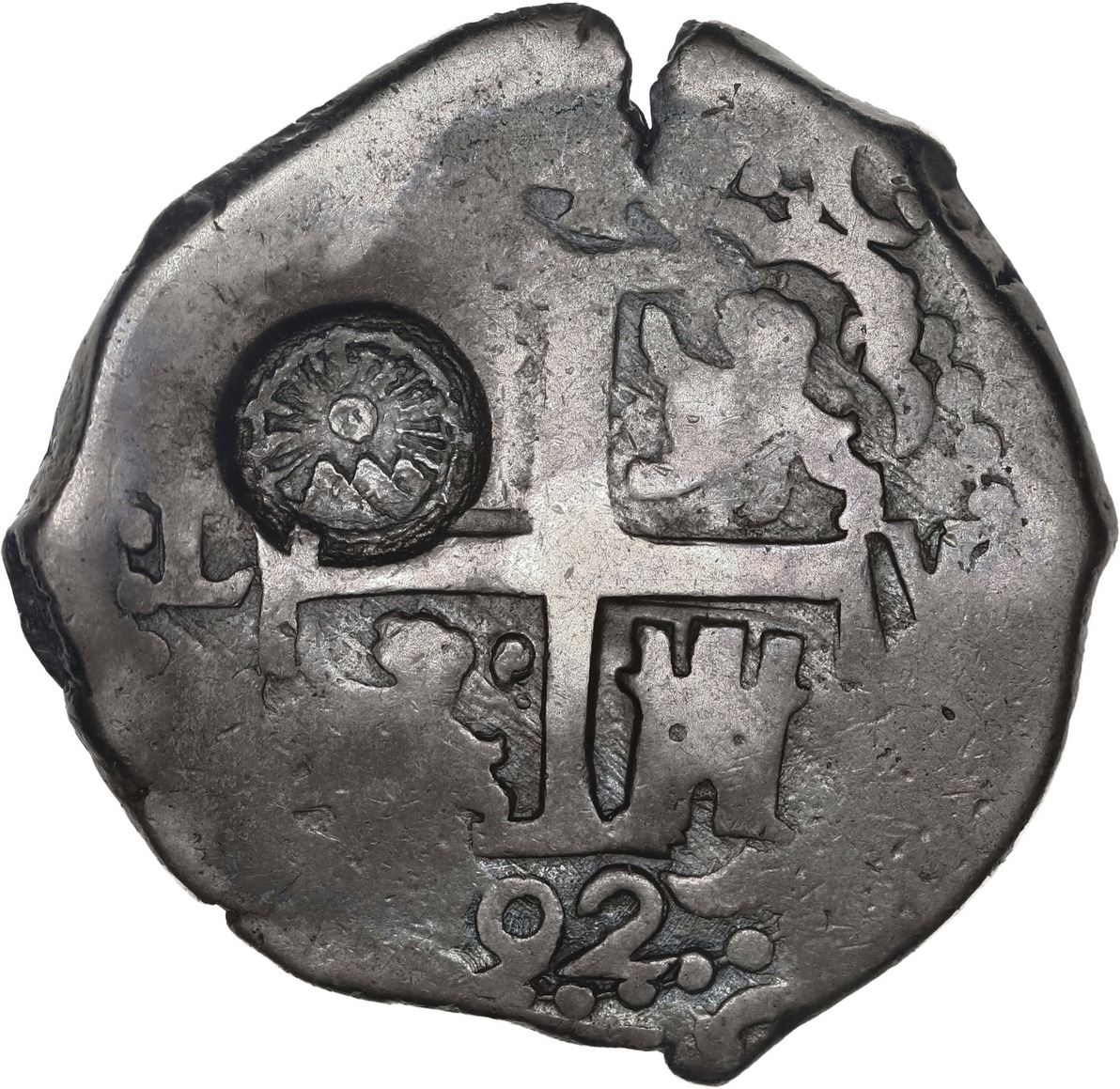 GUATEMALA, Guatemala City, 4 reales, sun-over-mountains countermark (Type II, 1839, contemporary counterfeit) on a Lima, Peru, cob 4 reales, 1692 V, rare, ex-Ponte. KM-90.1. 13.53 grams. Bold full countermark (XF, imitation counterfeit) over top-left quadrant of host's full cross-lions-castles with L to left, V to right, and 92 date below, also nearly full pillars-and-waves with clear second date and both mintmarks, toned Fine with small edge-crack. Pedigreed to the Luis R. Ponte Collection.