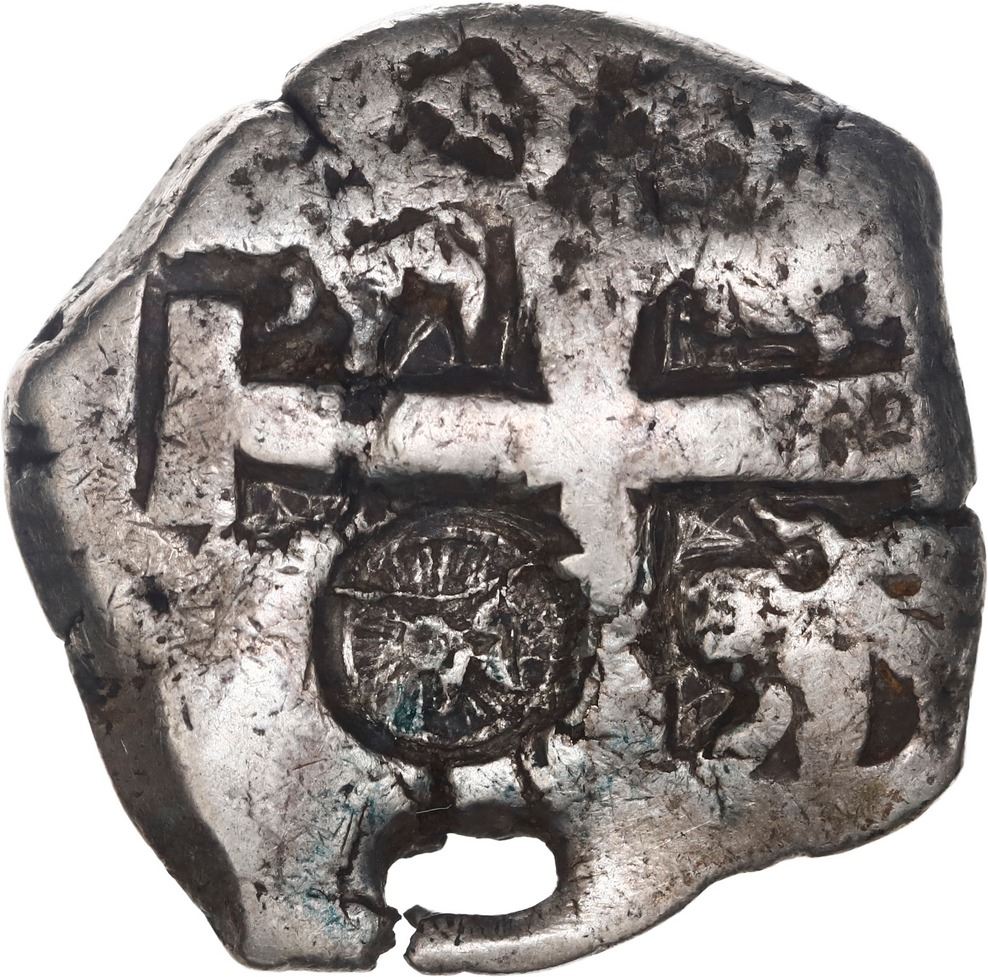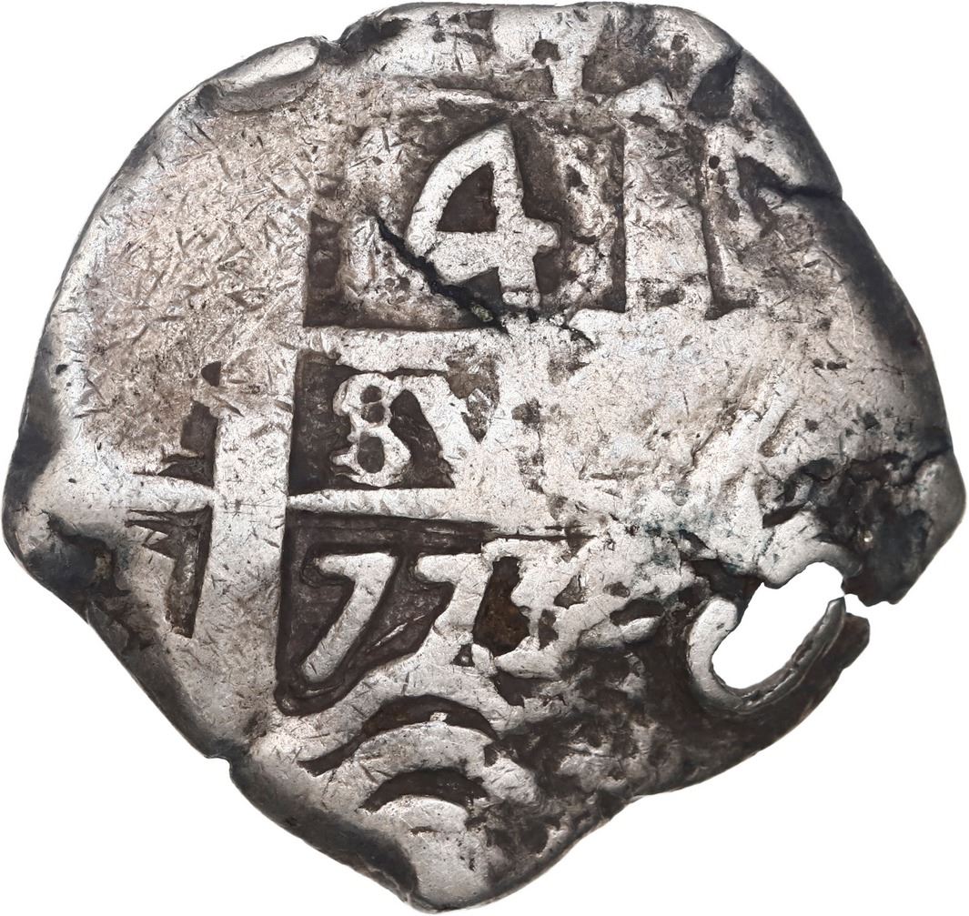 GUATEMALA, Guatemala City, 4 reales, sun-over-mountains countermark (Type II, 1839, contemporary counterfeit) on a Potosí, Bolivia, cob 4 reales, 1773/2 (V-Y), rare, ex-Ponte. KM-85.6. 13.20 grams. Crude but full VF countermark (imitation counterfeit) inside upper-left quadrant of AVF host's nearly full cross (over-sized), clear date above waves on other side (final year of cobs), lightly toned, with stripped rectangular hole at edge. Pedigreed to the Luis R. Ponte Collection.