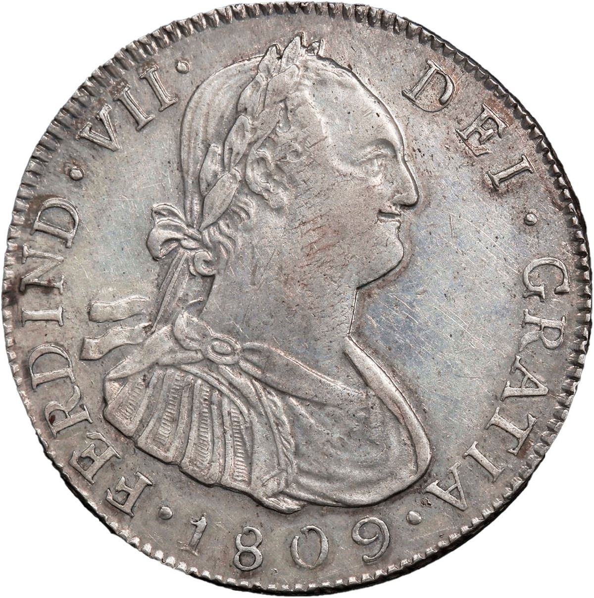 GUATEMALA, Guatemala City, bust 4 reales, Ferdinand VII transitional (bust of Charles IV), 1809 M, PCGS AU55, finest known in PCGS census, ex-Pat Johnson. JP-4R76; Cal-1042; KM-63. grams. Splashy light gray-gold toning over muted luster, weak in center of reverse but otherwise well struck, rare grade for this scarce transitional type. Pedigreed to the Pat Johnson Collection (stated on label).