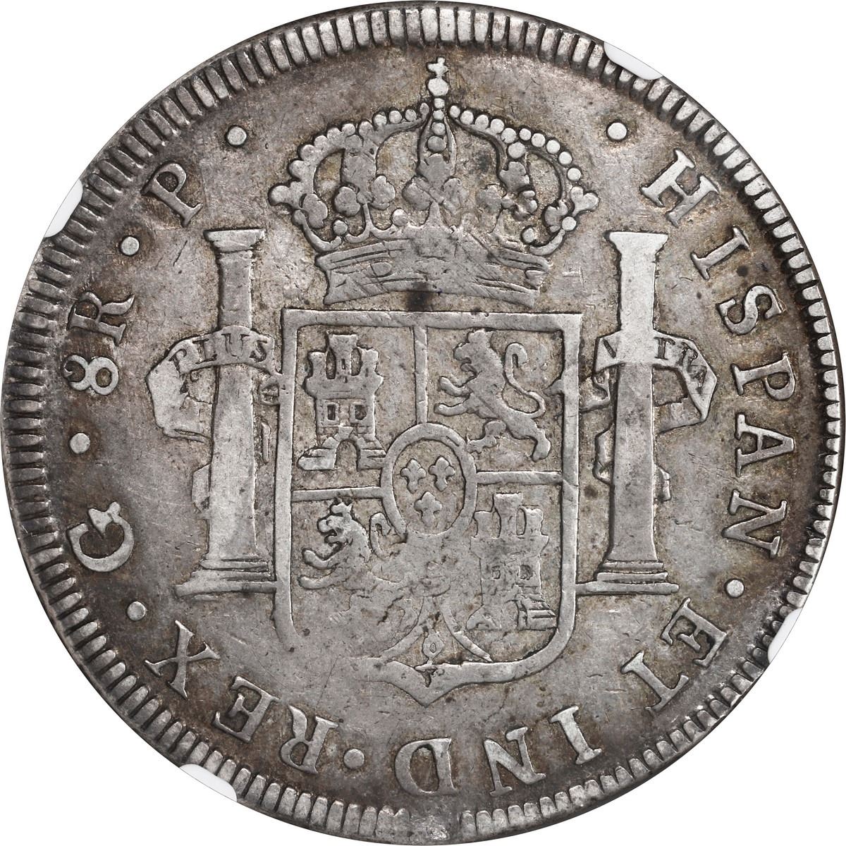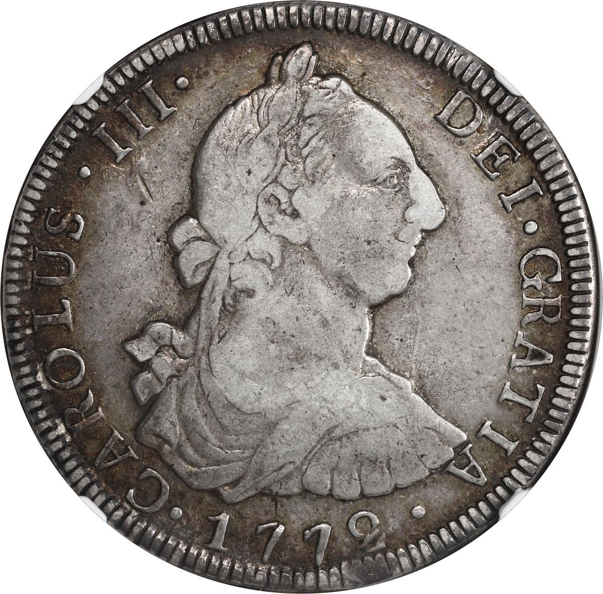 GUATEMALA, Guatemala City, bust 8 reales, Charles III, 1772 P, NGC VF 30. JP-8R41; Cal-1005; KM-36.1. Broad flan with full rims, rich toning (stronger in peripheries) over muted luster, small natural rim-flaw on reverse, first date of type.