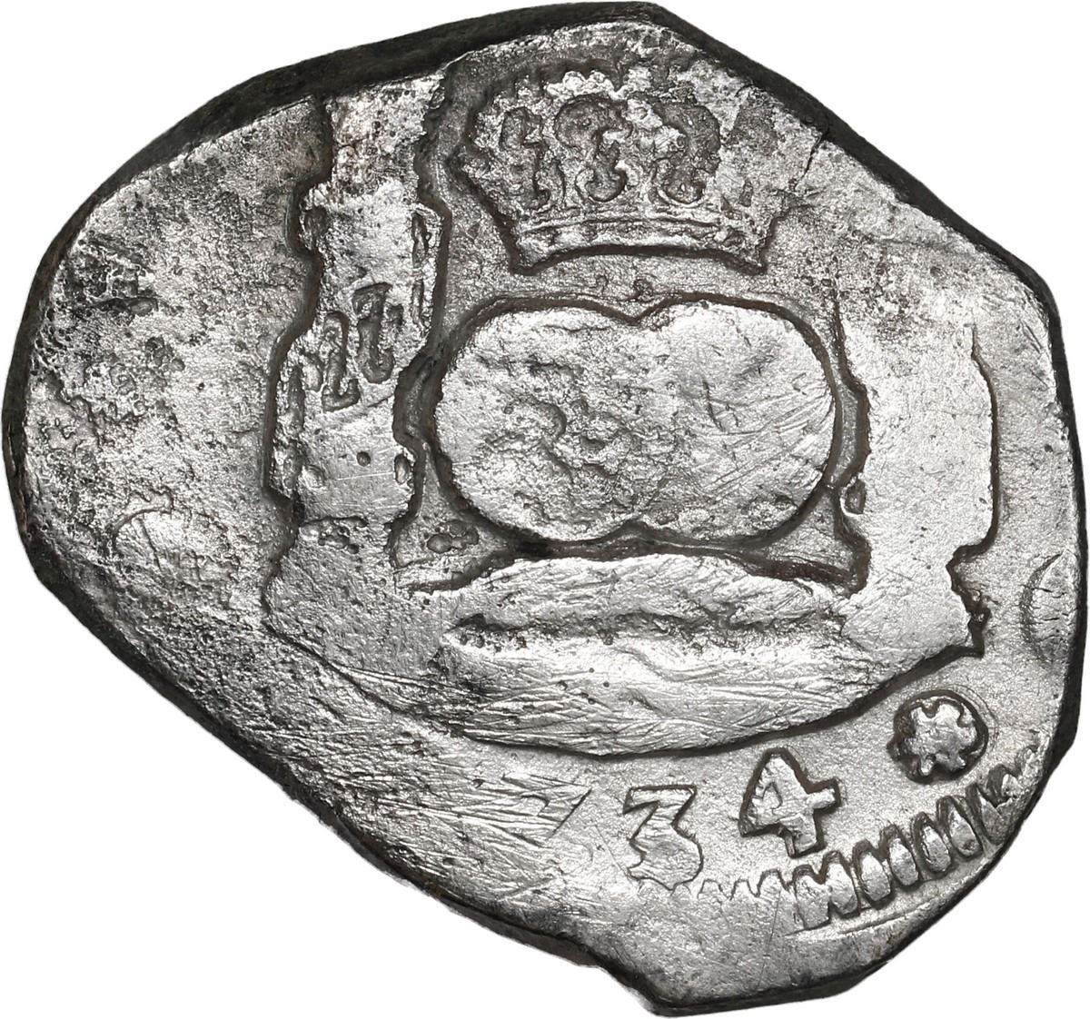 GUATEMALA, Guatemala City, cob 4 reales, 1734 J. JP-4R2; S-G1; Cal-1005; KM-5. 13.13 grams. Bold 34 of date below nearly full crown/globes/waves, bold denomination 4 to right of choice upper half of crowned shield, light surface corrosion, traces of luster, XF or better for grade. Recovered from: Hollandia, sunk in 1743 off the Isles of Scilly, southwest of England