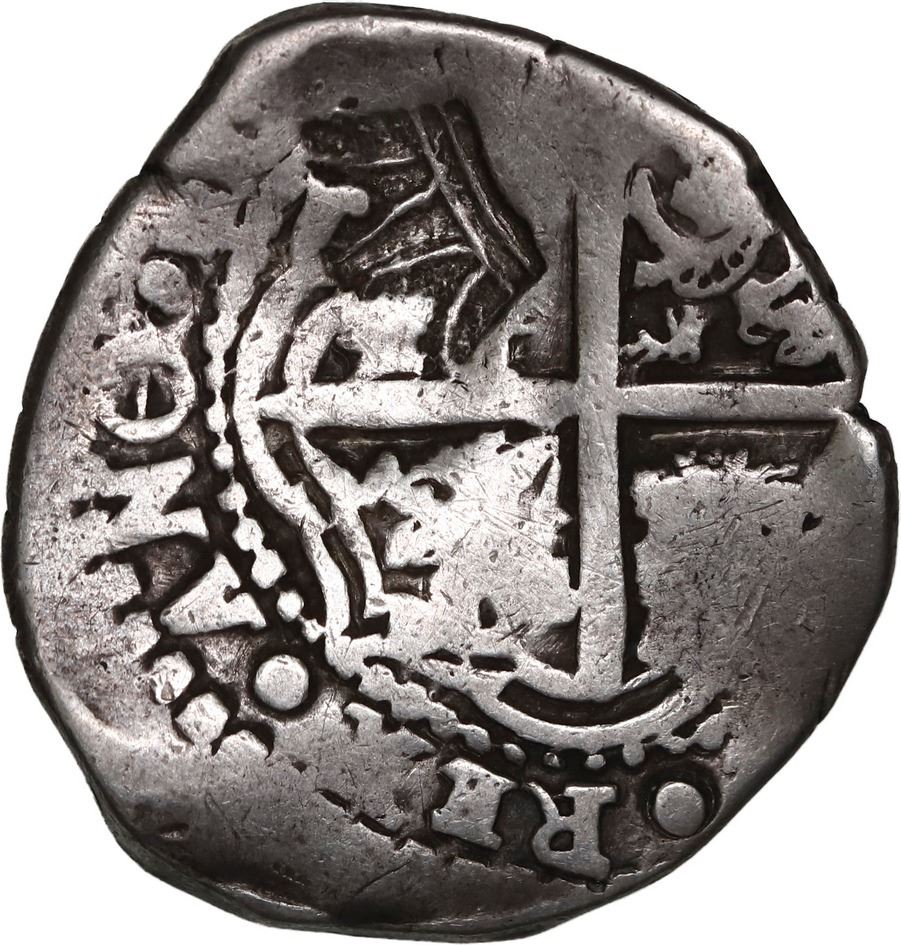 GUATEMALA, Guatemala City, "moclón" 2 reales, crown countermark (1662) on the shield side of a Potosí, Bolivia, cob 2 reales, (1650-51) O, rare, ex-Ponte. Perez Longo-Type C; Cal-838; KM-unl (host: S-P35; KM-14b; Cal-Type 239). 6.97 grams. Choice full countermark (smaller crown, XF grade) in top-left quadrant of full but off-center cross, the shield also off-center and showing a clear 2-O and king's name to right, Fine+ with nice toning, unusually late type for this countermark. Pedigreed to the Luis R. Ponte Collection.