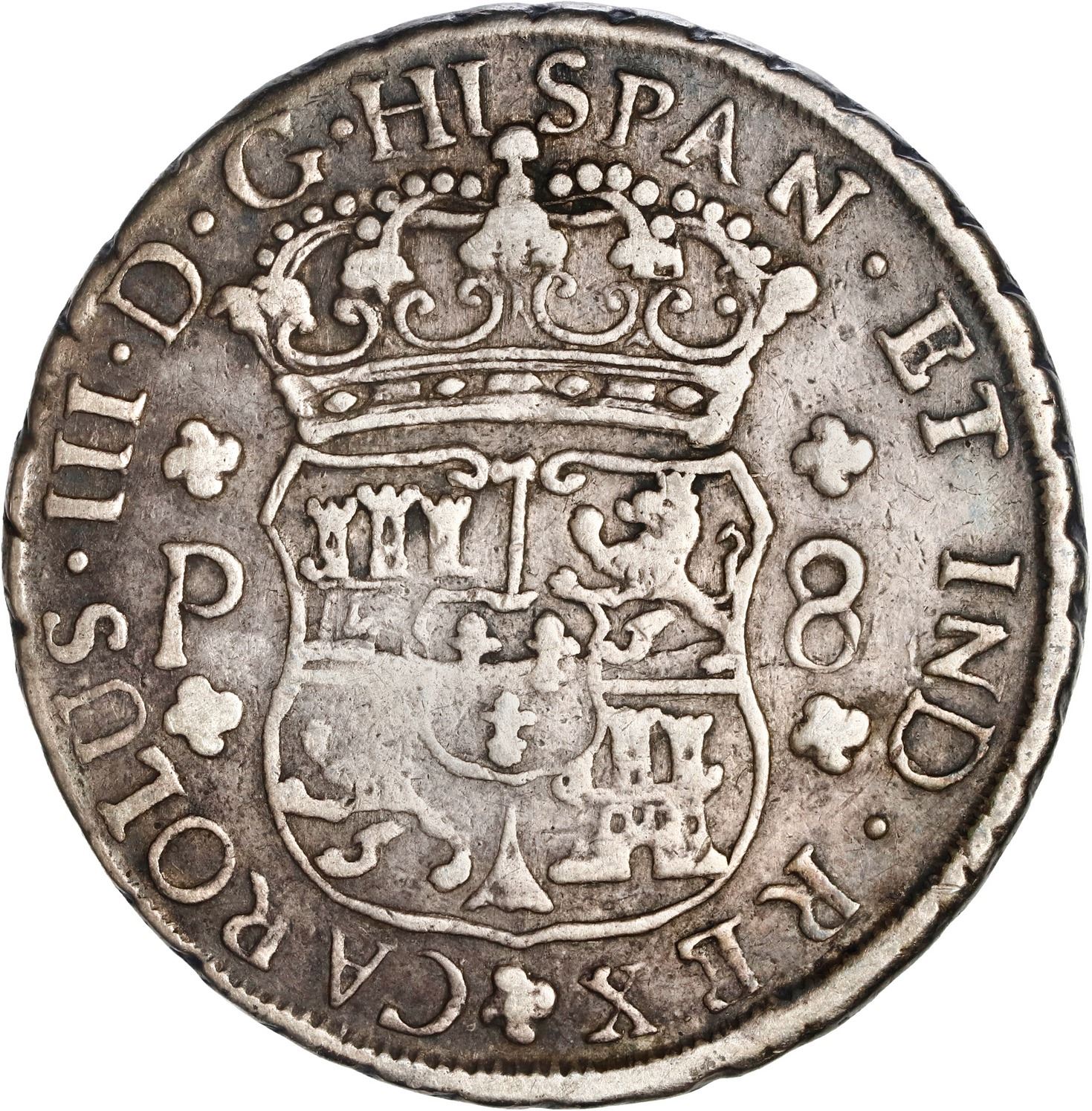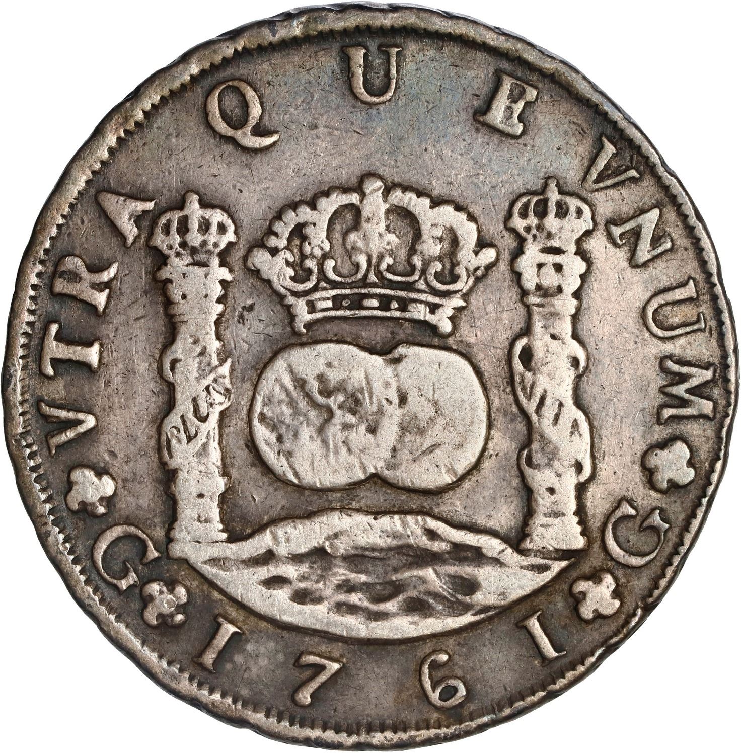 GUATEMALA, Guatemala City, pillar 8 reales, Charles III, 1761 P, with abacus below crown atop right