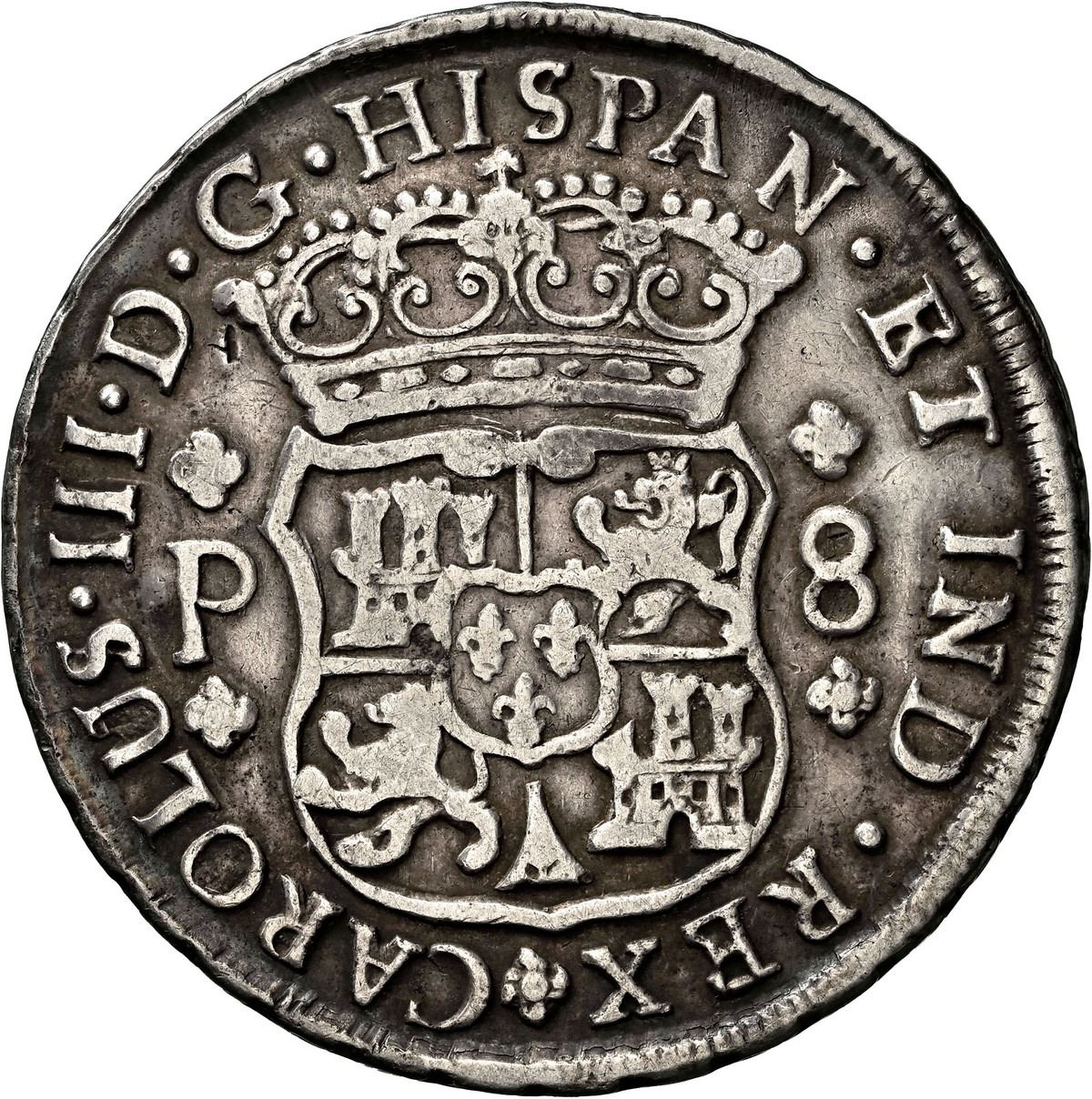 GUATEMALA, Guatemala City, pillar 8 reales, Charles III, 1765 P, NGC VF details / chopmarked. Yonaka-G8.65; JP-8R34; Cal-997; KM-27.1. Attractively toned, with tiny chopmarks on both sides and light graffito below Q, rare key date (R2 in Yonaka, R in JP), an interesting and pretty coin for the grade.