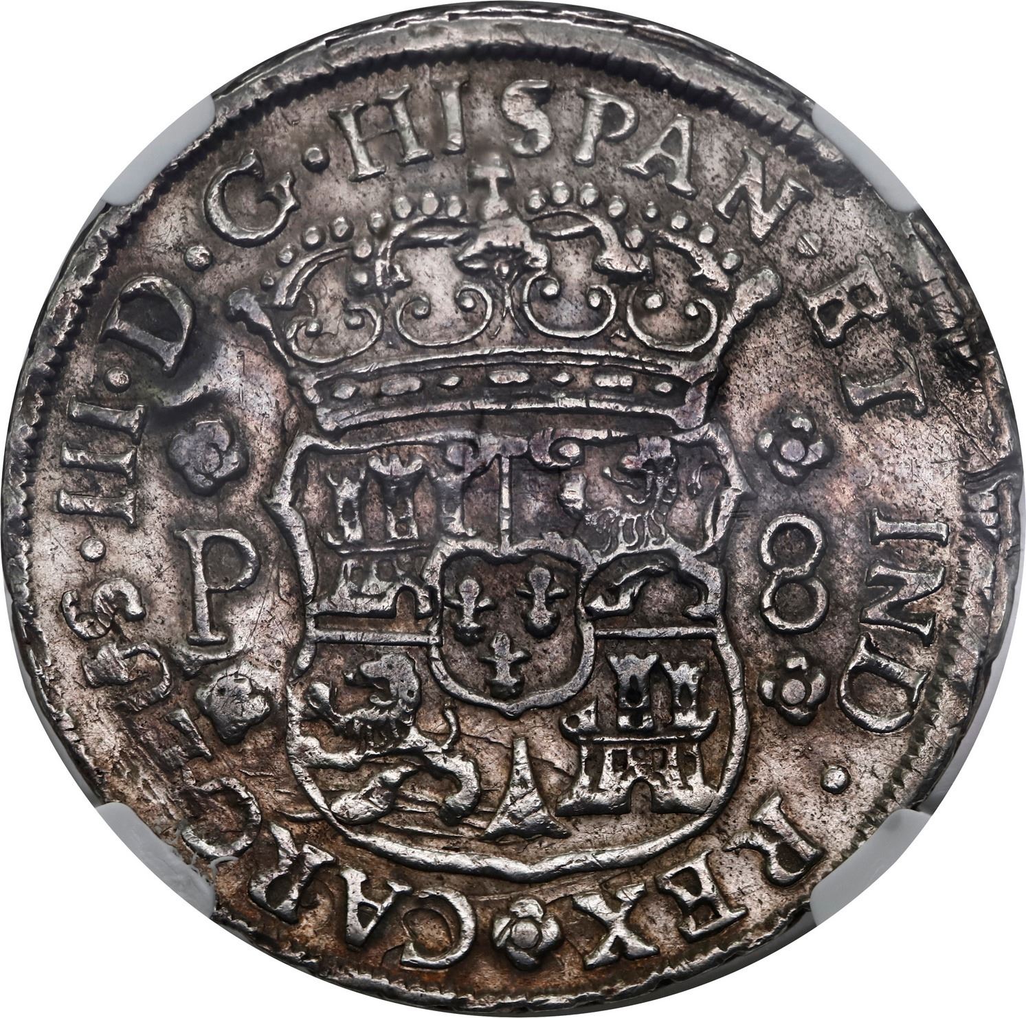 GUATEMALA, Guatemala City, pillar 8 reales, Charles III, 1768 P, NGC AU 50.