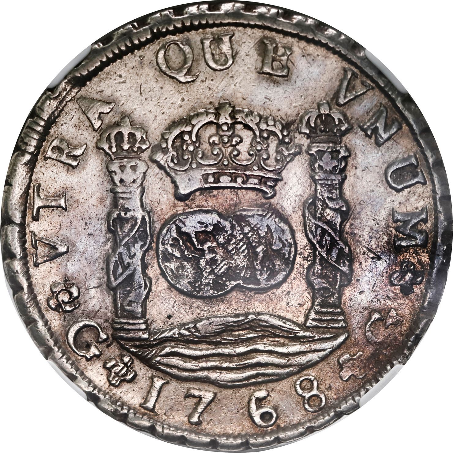 GUATEMALA, Guatemala City, pillar 8 reales, Charles III, 1768 P, NGC AU 50. JP-8R37; Yonaka-G8.68a; KM-27.1; Cal-1000. Very lightly rainbow toned over muted luster, with adjustment marks on globes, unusual die-clash at bottom of shield and some other odd flaws but in all the normal variety for this date. While more of this date can be found in the NGC census than any other of the type, they very seldom come up for sale in AU or better grade.