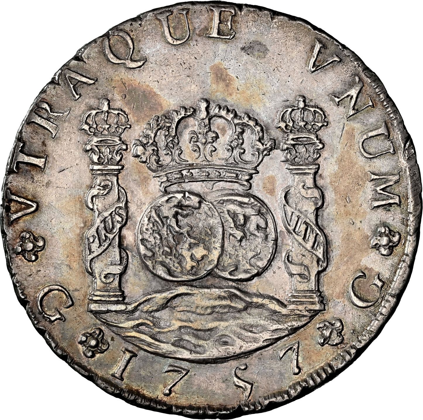 GUATEMALA, Guatemala City, pillar 8 reales, Ferdinand VI, 1757 J, NGC AU details / cleaned, ex-Brameld. Yonaka-G8.57; JP-8R25; Cal-434; KM-18. Lustrous and clearly high grade with colorful toning, surface hairlines, weak rims (as made) with natural flaw a 9 o'clock on shield side. Pedigreed to the David Brameld Collection.