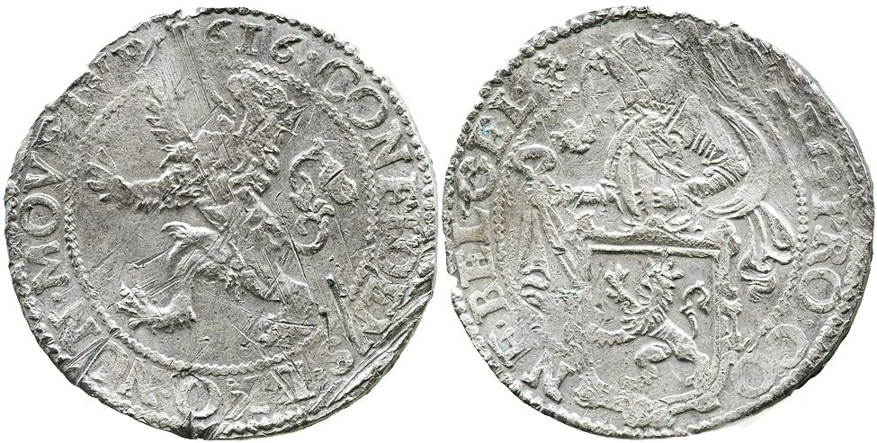 Gelderland, United Netherlands, "lion" daalder, 1616. KM-15.1. 26.9 grams. Excellent full details on both sides, including legends, with no corrosion or wear (in fact lustrous), but fraught with old scrapes. Recovered from: Campen, sunk in 1627 off the Isle of Wight, south of England