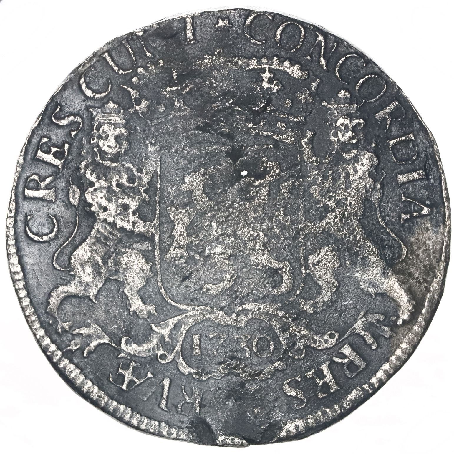 Gelderland, United Netherlands, "rider" ducatoon, 1730, ex-Ponterio. KM-95.3; Dav-1824. 30.03 grams. High grade details (AU or so) with corroded and dark surfaces, small "pinhole" at center from crude planchet or corrosion (or a combination thereof), rare wreck provenance and the first one we have offered at auction. Pedigreed to the Ponterio sale of September 1987, lot 502 and with Sedwick certificate from 2003. From: De Visch, sunk in 1740 off South Africa