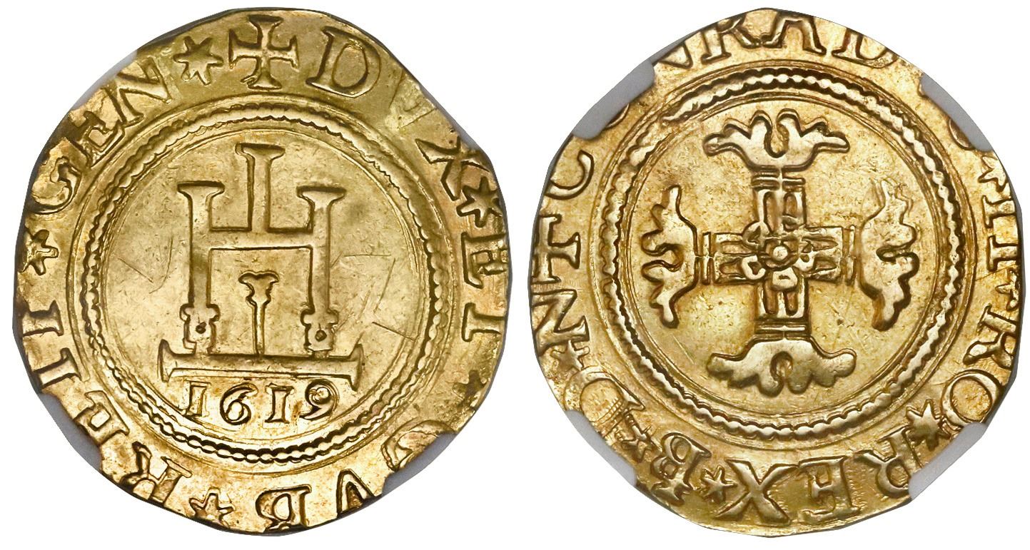 Genoa, Italian States, 2 doppie, 1619DN, NGC AU details / scratches. KM-28; Fr-418. Scarce type in nice grade with full details, just some old pin-scratches in field on date side. NGC #4439601-001.