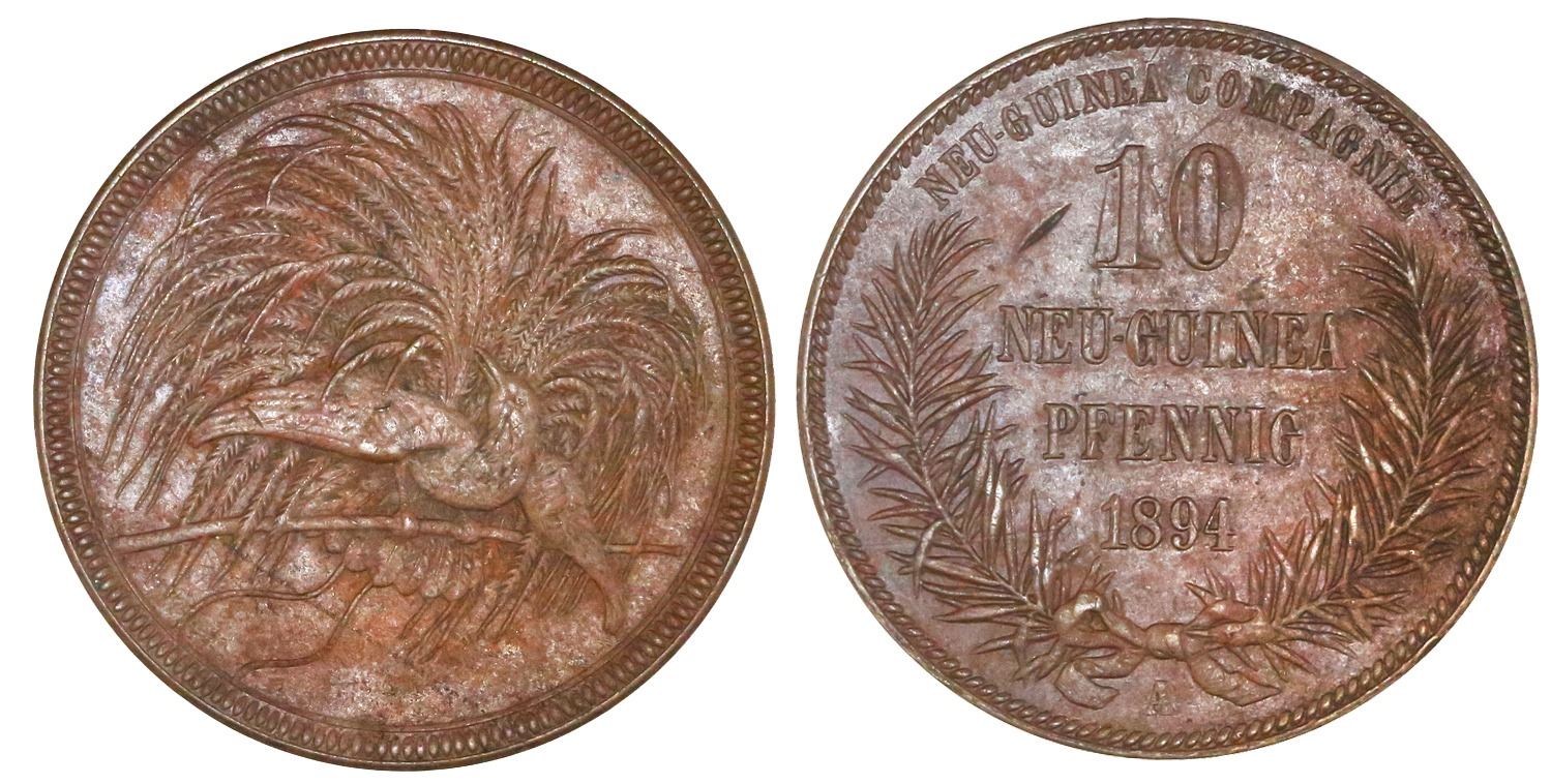 German New Guinea (struck at the Berlin mint), bronze 10 pfennig, 1894-A, NGC AU 55 BN. KM-3. Fully detailed strike with practically no wear but old mark (test?) to left of denomination, even copper color throughout. NGC #4715670-012.