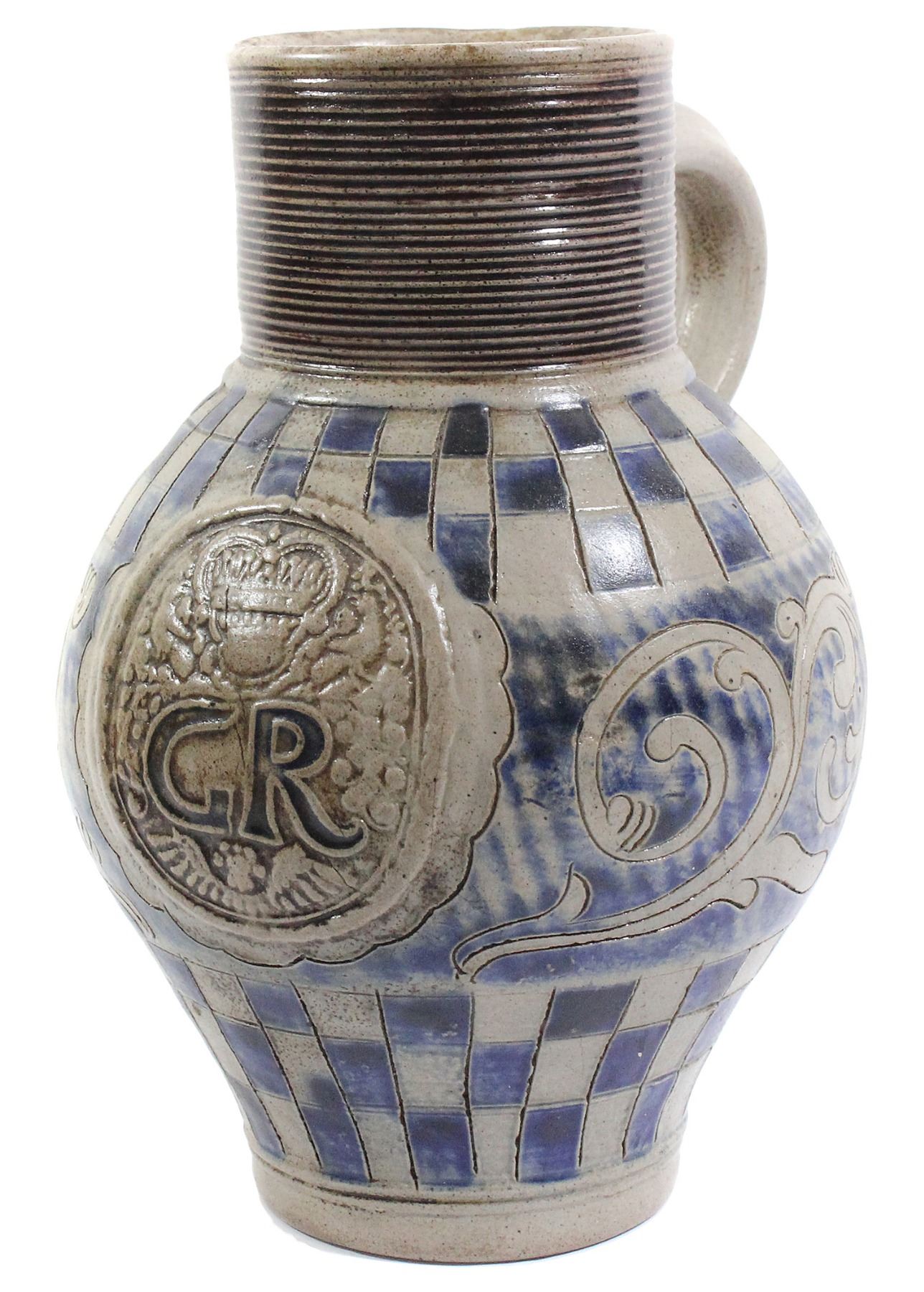 German Westerwald jug with George II marking as from British colonial Virginia, ca. 1740-1760.