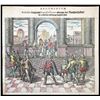 German copperplate engraving by Theodore de Bry showing Atahualpa delivering his ransom to Pizarro, from America, 6th book (1597), hand colored. 12-3/8" x 8-3/8" (image 7-3/4" x 6-1/2"). Just prior to the iconic de Bry scene of Atahualpa being strangled to death by Pizarro's men using a garotte, this engraving depicts the Inca king chained at his feet to a chair seemingly reasoning with a standing Francisco Pizarro in a stately room, with pink and white tiles on the floor. One wonders whether he knew his fate at that moment. Some foxing not affecting the image and several small pinholes.