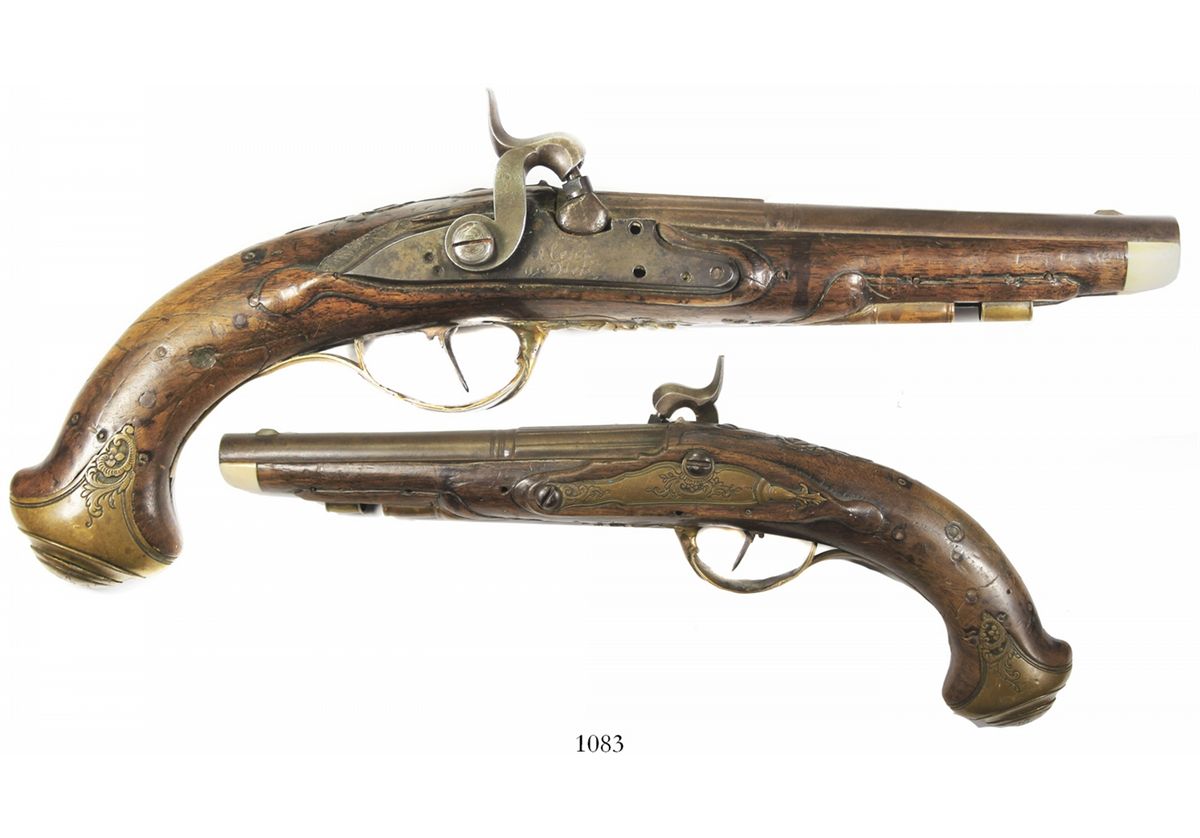 German gentleman's flintlock-to-percussion pistol, ca.1760-1780. 626 grams, 13-1/4" long. A high-quality gun that must have belonged to an officer or a wealthy civilian, originally a flintlock but converted to percussion, with maker's mark "alen a. dietz" signed on the lockplate, turned and fluted barrel (brownish in color, 7" long), walnut stock with carved decorations and ornate brass mounts (trigger-guard, buttplate, sideplate and ramrod holder, the ramrod typically missing) and ivory fore-end tip. The lock appears to be complete but loose (needs adjustment to be fully functional), operational trigger.