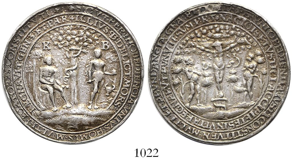 Germany/Bohemia, silver medal, Adam and Eve next to tree of knowledge / crucifixion scene, copied after Hans Reinhart (1536). 24.99 grams. Very busy but artistic design with double-row legends, VF with gorgeous old rainbow toning, minor rim-bruises, similar but not identical to Habich-1968.