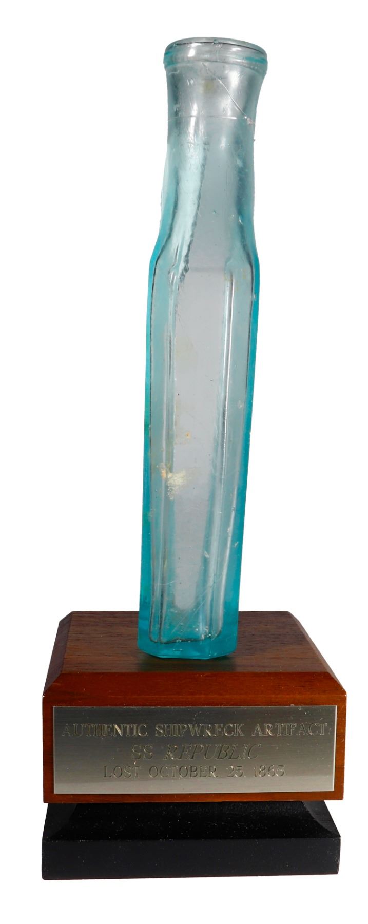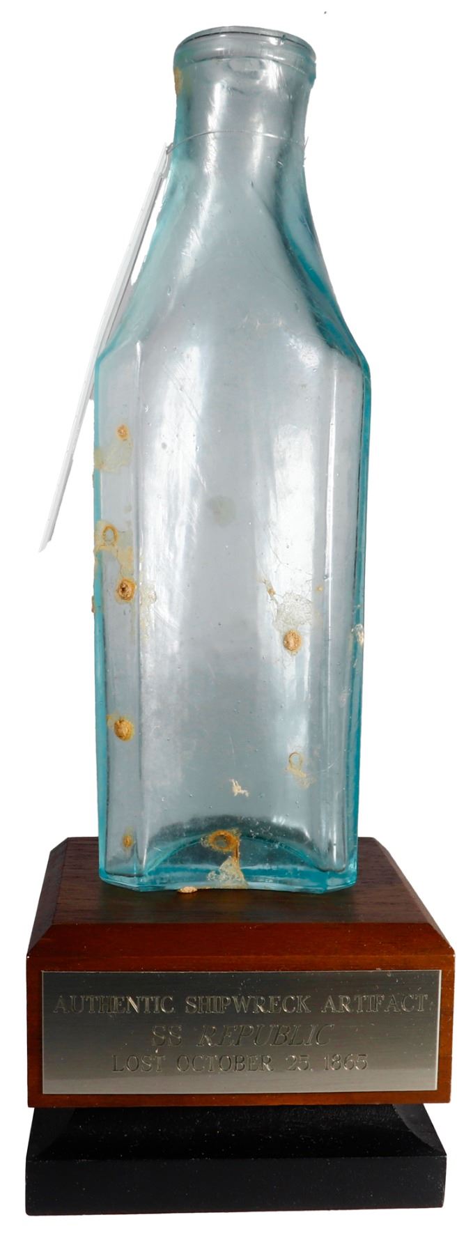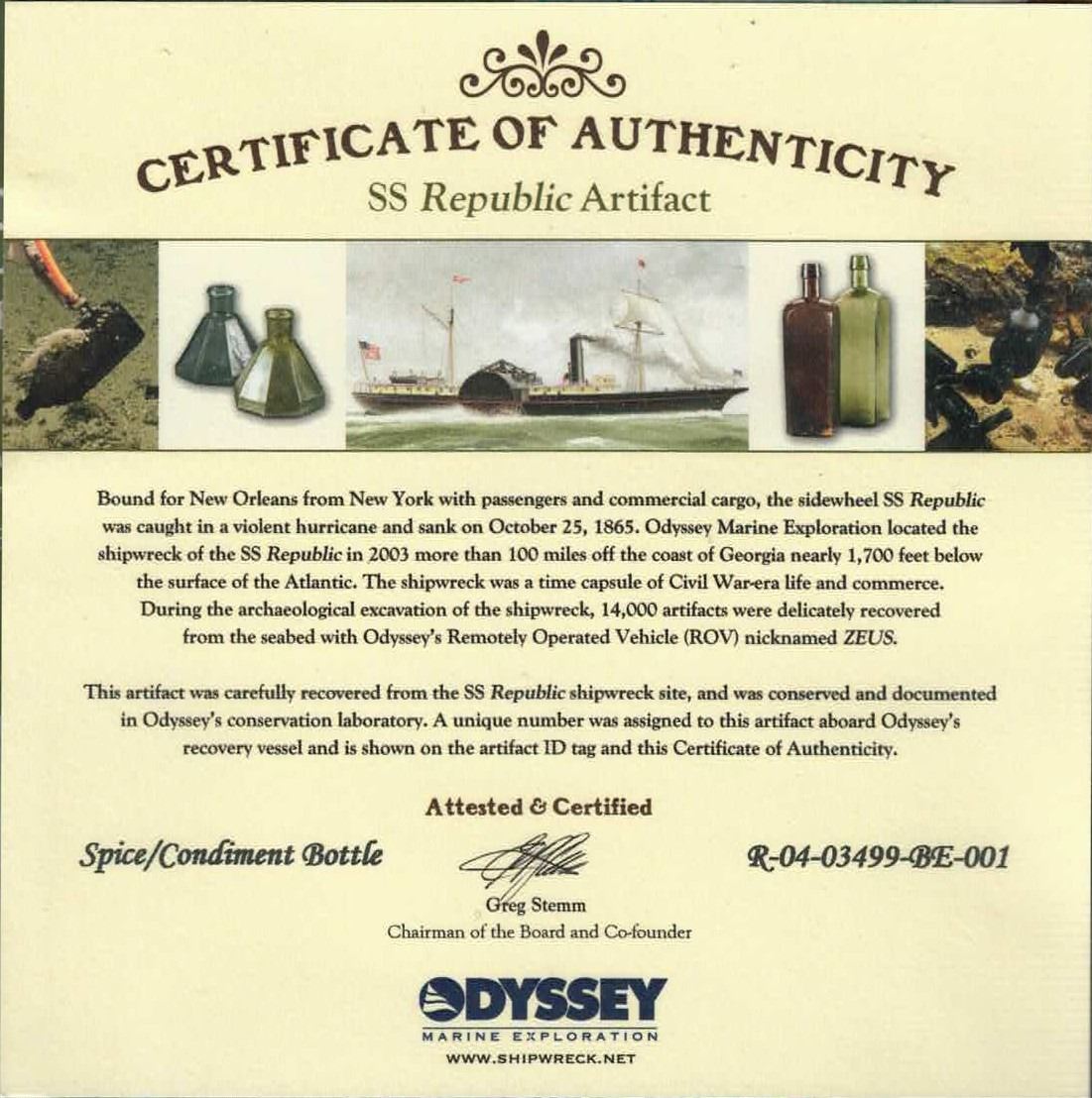 Glass spice or condiment bottle, with stand, ex-S.S. Republic (1865). 153 grams. 6" tall x 2" x 1". Small opaque green glass bottle with bits of encrustation here and there, intact. From the S.S. Republic (1865), with original tag and certificate R-04-03499-BE-001 from the salvors.